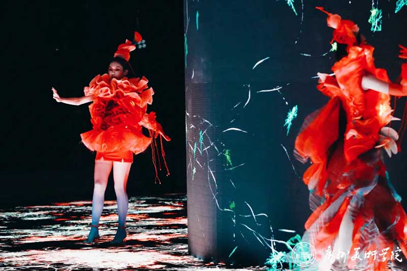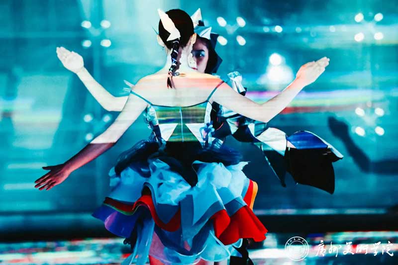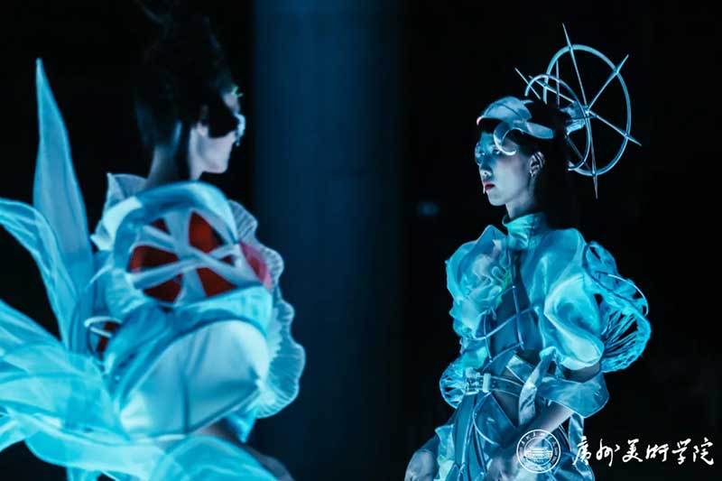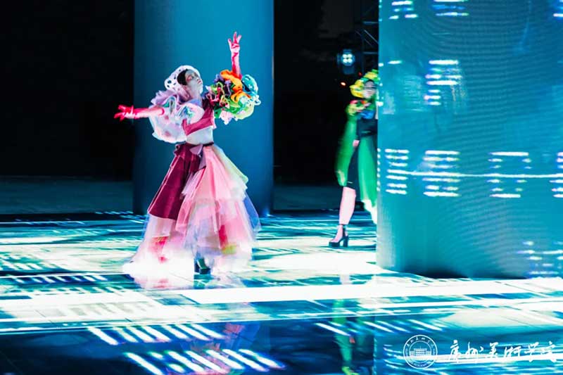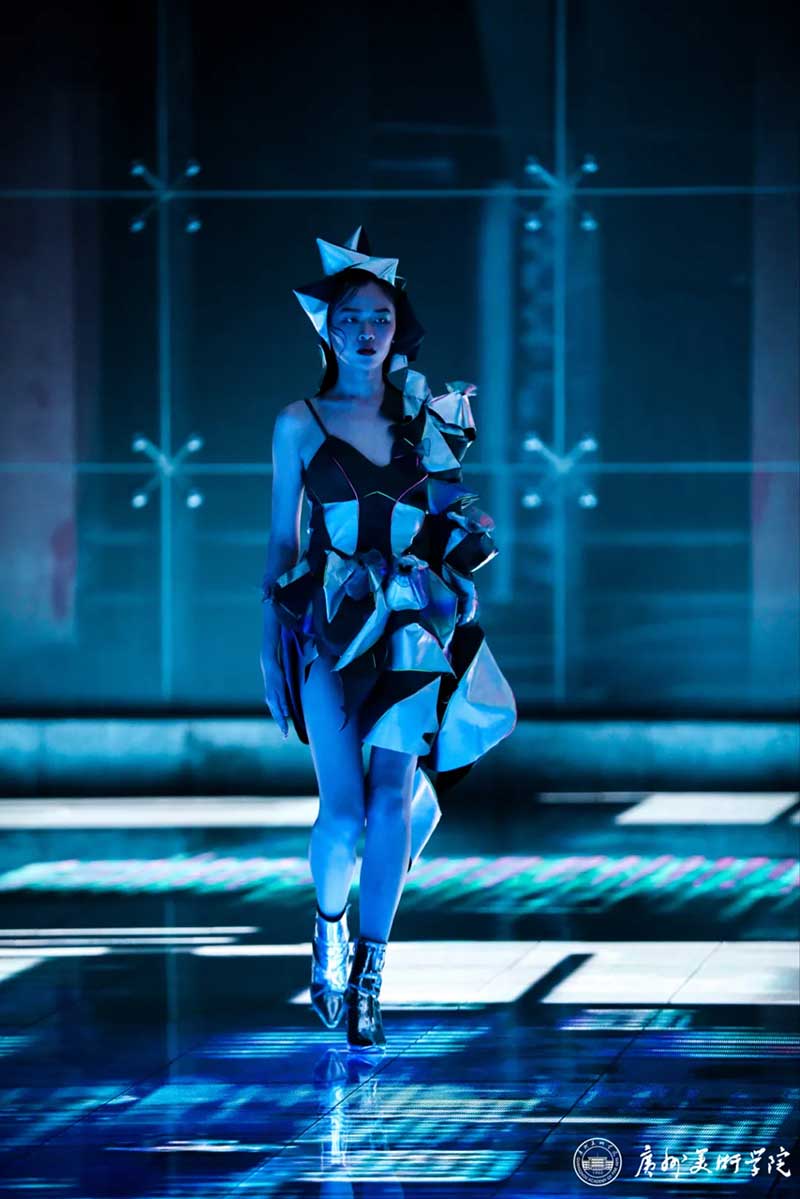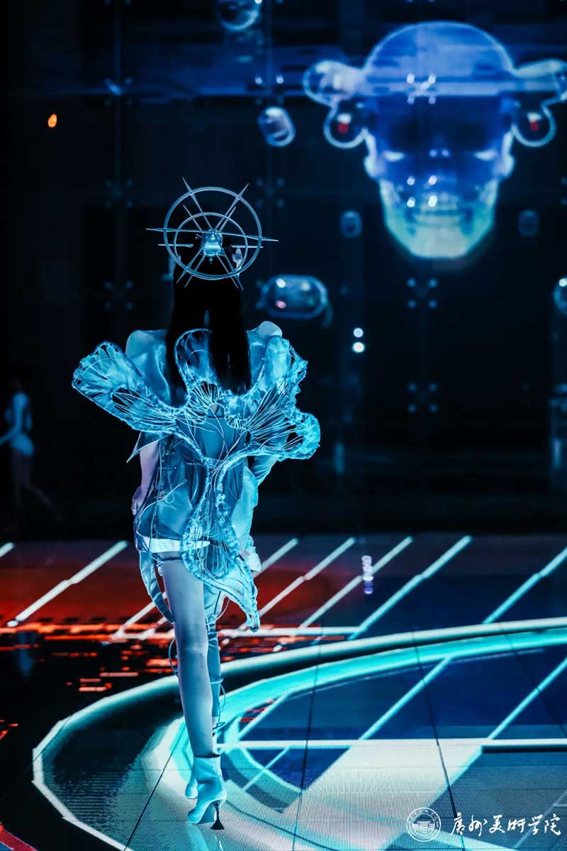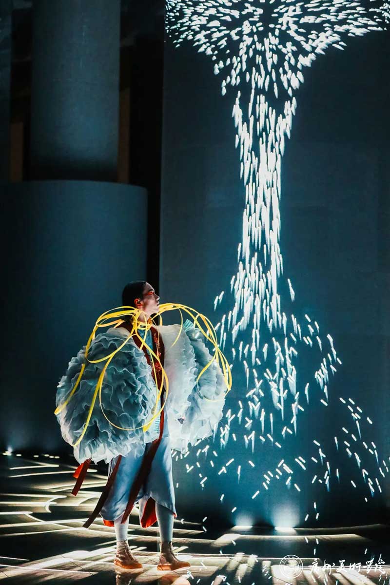 《屏视世界:融合与聚变》是一个融合广州美术学院视觉艺术设计学院数字媒体艺术2021届18名毕业生和广州美术学院工业设计学院服装与服饰设计专业2021届13名毕业生的一次沉浸式新媒体服装艺术展演的创新尝试。《屏视世界:融合与聚变》的舞台并不单一指向技术手段上的跨学科交流,更是我们对自然和未来应有的敬畏和憧憬。