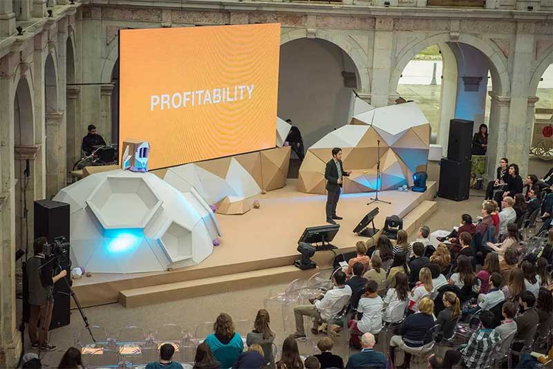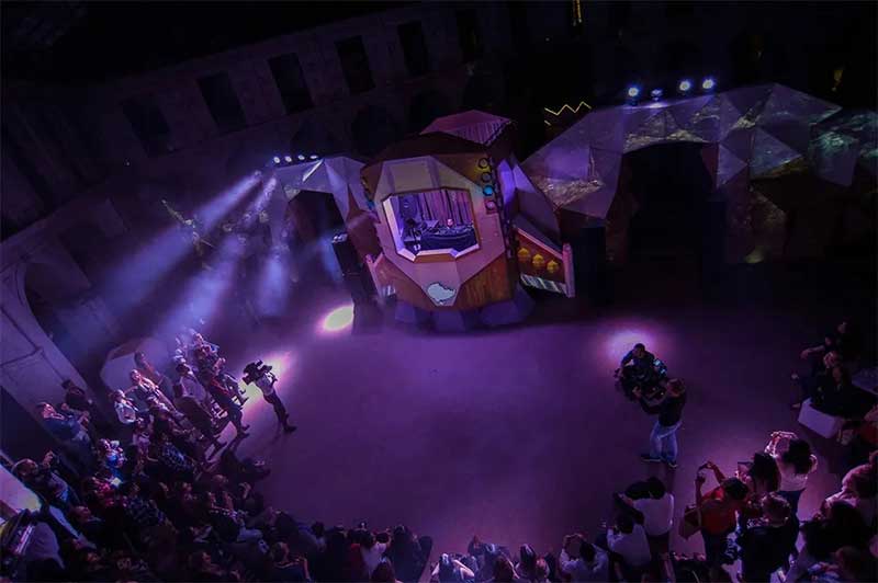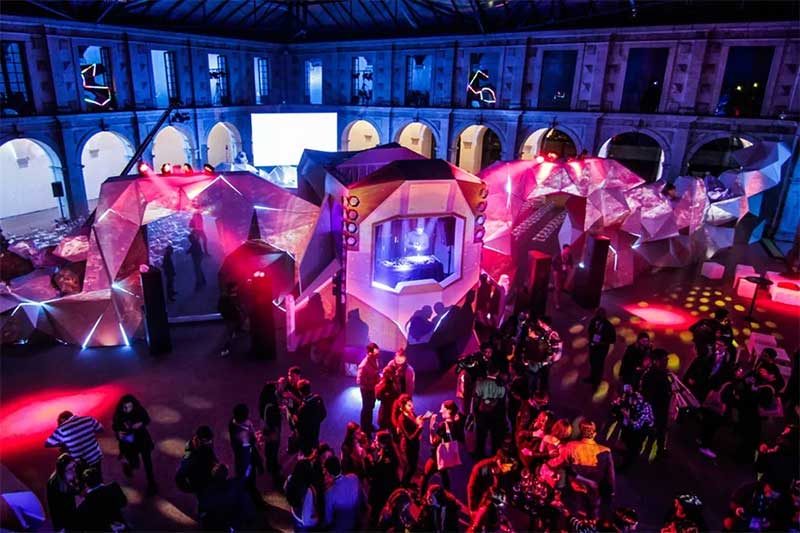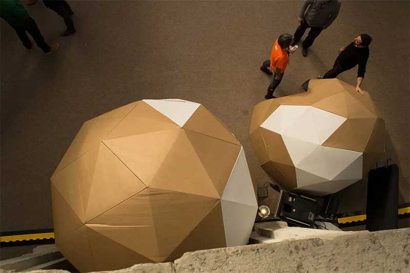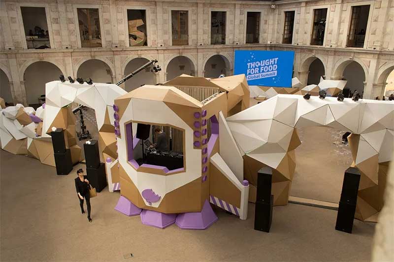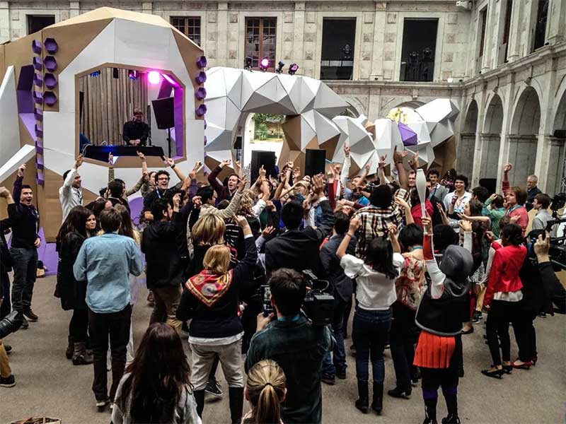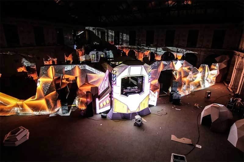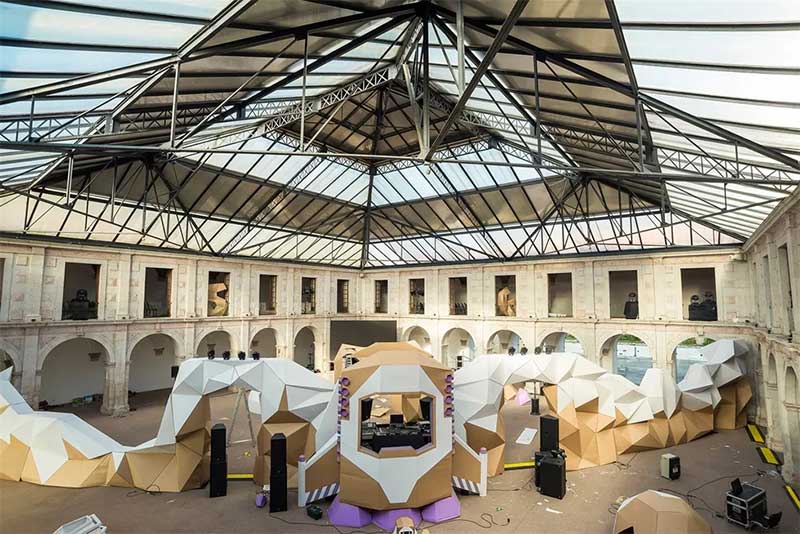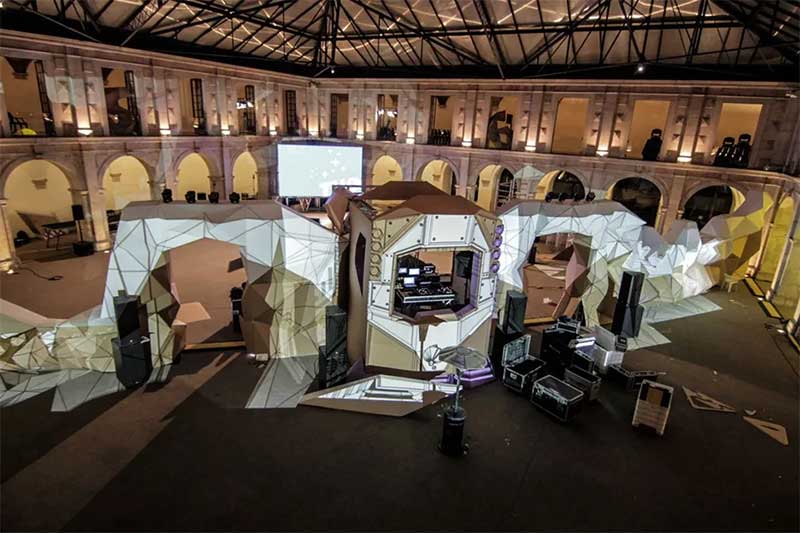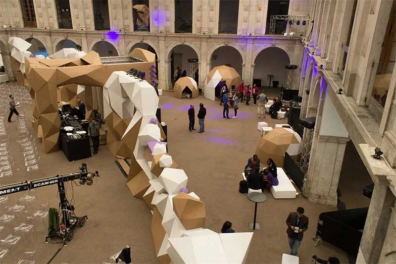 为了让现场的装置在白天和晚上都充满活力,活动将LED灯带固定在纸板的接缝处,让白天也能看到闪动的光影。在峰会的最后一天,墙面上使用了7台12k投影仪,向参会者展示了一段精彩的视频映射,讲述了一个来自作家儒勒·凡尔纳的科幻故事,结束了这一场精彩的活动。