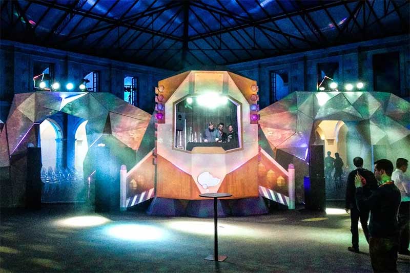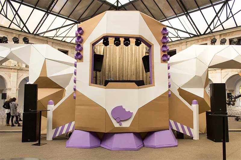 现场所有的装置都是用可回收的瓦楞纸做成,一个40米长的模拟月球陨石坑的纸墙将活动现场空间分成两部分,一边是会议区,另一边是休闲、聊天和聚会的公共区域。这个区域的中心是一艘5米高的飞船,它也是现场的DJ工作区,还有各种带有灯光的休息舱,来宾可以在那里休息,也可以用荧光笔在墙上留言。