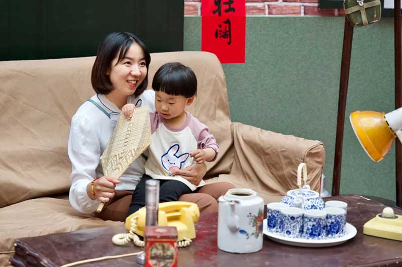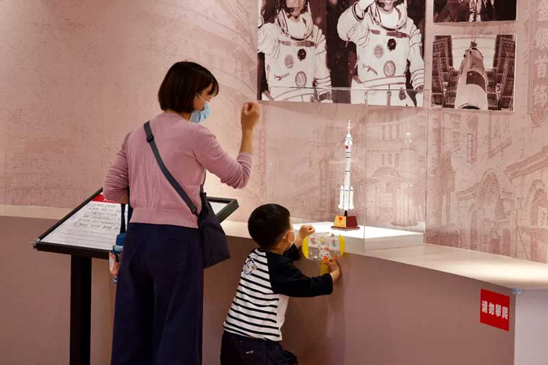 时光长廊、年代照相馆、祝福寄语墙的设计将历史符号变身与游客亲密连接的当代文化创意内容与产品,浸润了厚重历史与日常生活的时光交叠之美,如此多维社交场景的搭建,也满足了年轻观众对于留言纪念、互动体验的需求,传播力满满,是人气爆棚的网红展必备的功能性设置。从现场氛围来看,这种结合音乐、文字与立体空间艺术品的综合体验方式,更加能够带动观展人对党和历史进行理解和共鸣。展出日适逢母亲节,许多母亲带着孩子来打卡,在这个怀旧感满满的展览中母亲可以与孩子们一同回顾自己的儿时记忆,重温爱国、爱家的初心,畅谈所见所感,在享受一段绝佳的亲子时光的同时,将爱党爱国融入家庭教育和家风建设中,在孩子们心中播下一颗温情滋养的种子。新奇的玩法对青少年们更具有吸引力,一张张历史照片,一个个时代新貌,一段段动听故事,孩子们在创新历史“有声书”中被祖国日新月异的变化所感染。