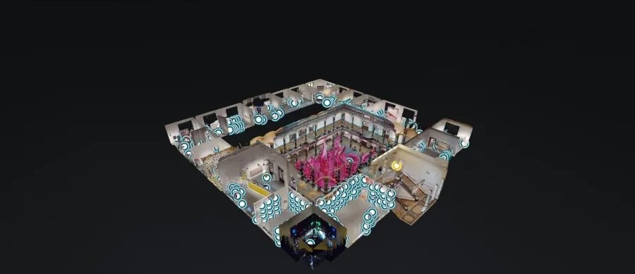 走进占地900坪的Gropius Bau美术馆,中庭的装置《A Bouquet of Love I Saw in the Universe》(我在宇宙看见的一束花朵)从地面长出桃红色的充气触角,触角上满是黑点,这是草间弥生为此次回顾展特别创作的作品。与展览同名的〈A Bouquet of Love I Saw in the Universe〉是件巨大作品,18根触角般装置占满美术馆大厅,最高达11米。