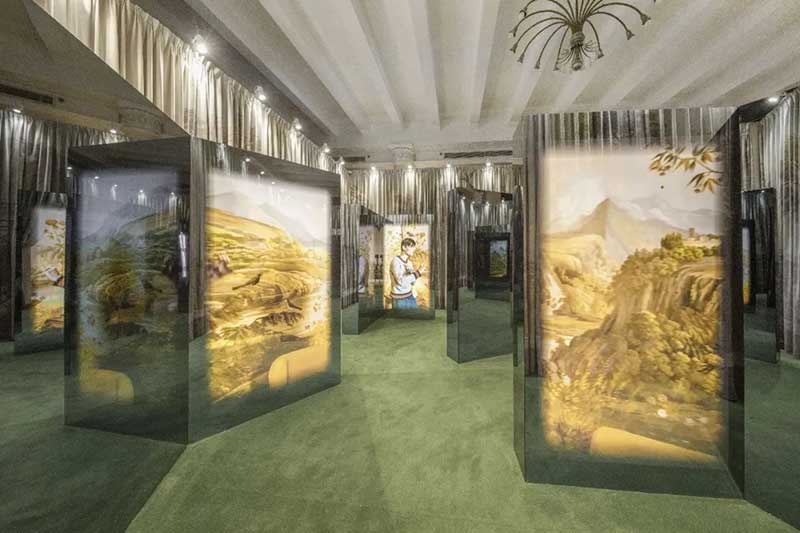 魔幻的镜面迷宫演绎惊艳的错视意境,转动的屏风融入雄狮城堡壁画元素,将观者带到佛罗伦萨蒙特斯佩托的雄狮城堡,重温Gucci 2016早春系列广告形象大片,在恣意舞动中感受浪漫主义的自我风格。