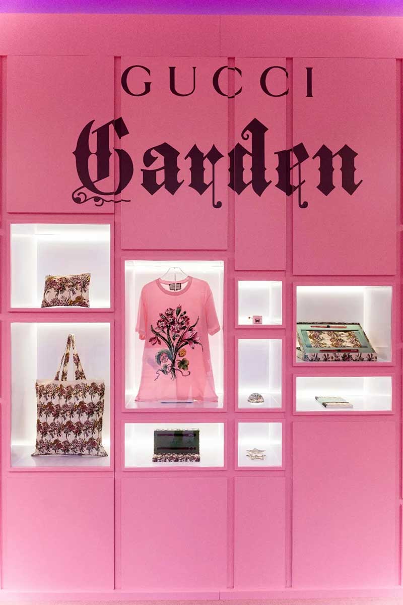 花悦仙境灵感源于Gucci Bloom花悦系列,整个空间弥漫着怡人花香,点缀着蜡叶印花图案的红白沙发上放着连衣裙,华丽而不为人知、充满青春探险的封闭式花园,是否让你联想起慵懒明媚的春天。