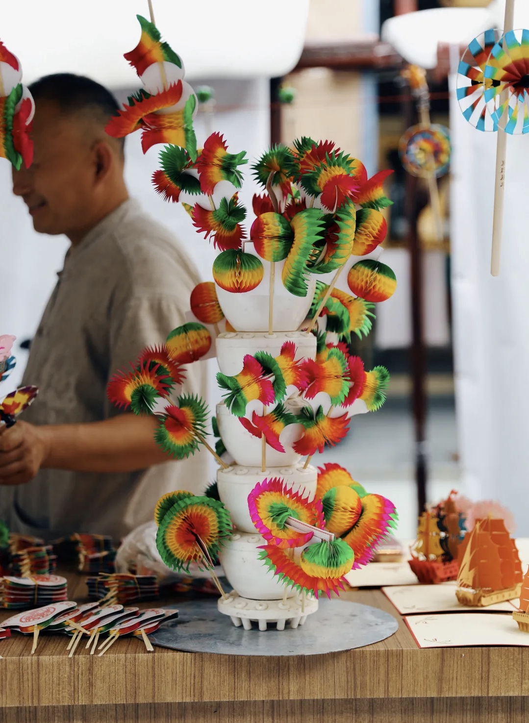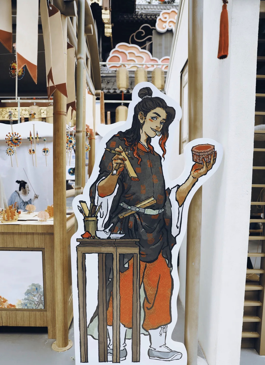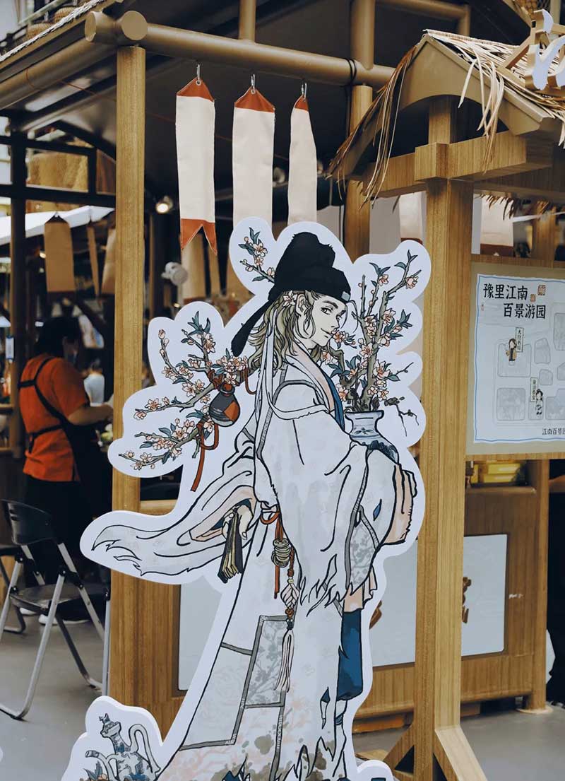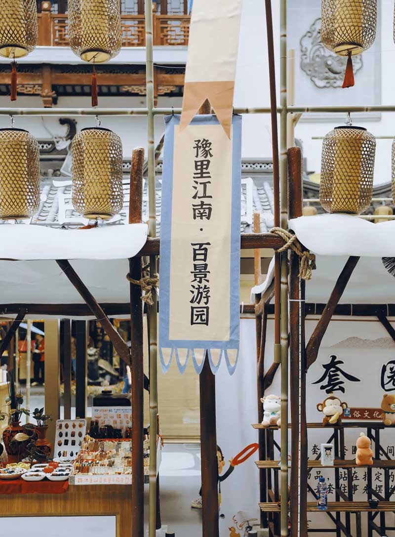 除了传统手工艺,这里还有很多文创周边,制作精良的微缩世界,处理得当的细节与mini的比例,让人大开眼界!精巧的竹编、江南写意纸扇……在这里不仅可以感受传统的韵味,还能领略豫里江南的古文化之美。仲夏之际,万物明媚,穿梭于市井小摊之间乐趣十足,随处可见的《江南百景图》人物立牌,为江南市集增加了潮流氛围,游戏粉快来跟严大人合照!