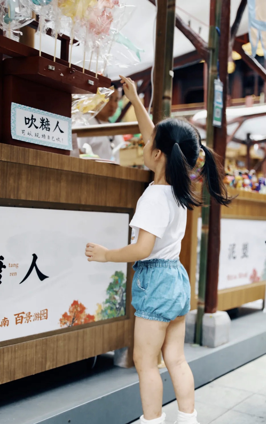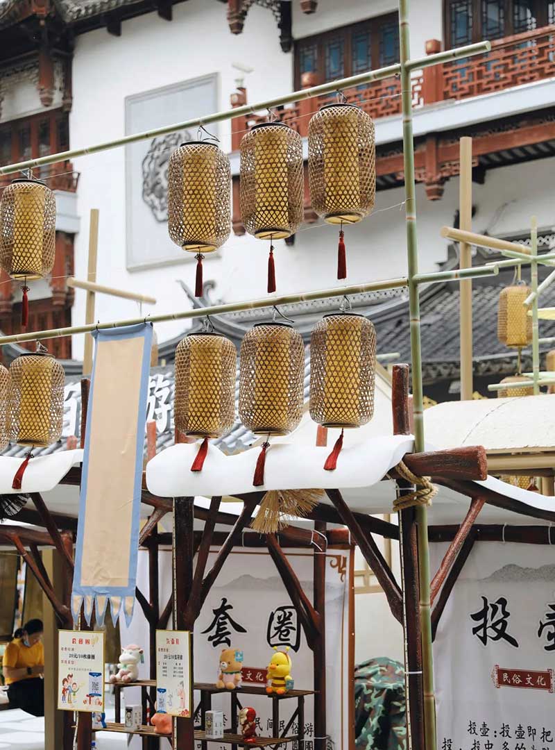 在豫园商城的中心广场上,坐落着一处小而精的“江南市集”,这是豫园商城联合《江南百景图》游戏合力打造的“豫里江南·百景游园”,首届沉浸式夏日江南市集。“古风IP+实景游戏”,把游戏控与古风爱好者全都拿捏住了!一个个竹制小摊位挂满彩旗、灯笼,在阳光下随风摇曳,别致动人。别看市集不大,但玩法多样,那些只在古装电视剧中才会出现的“古风市集”,被复刻呈现在这里,投壶、糖人、皮影戏……原地穿越,让人一时之间分不清现实与虚幻。