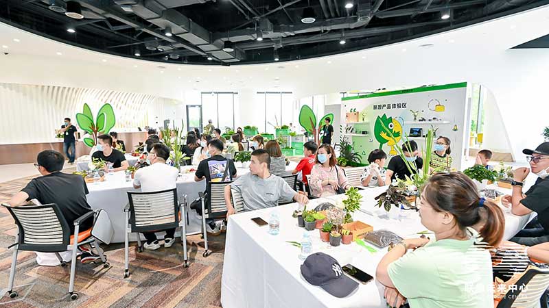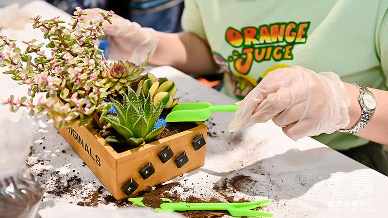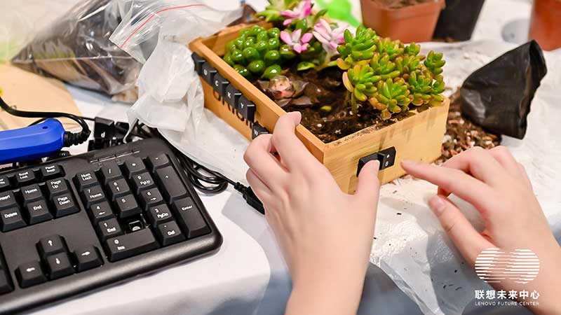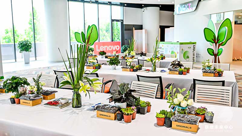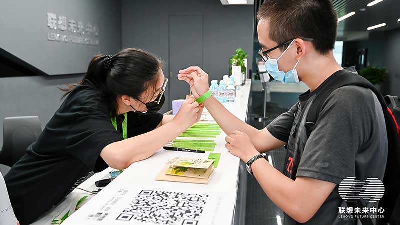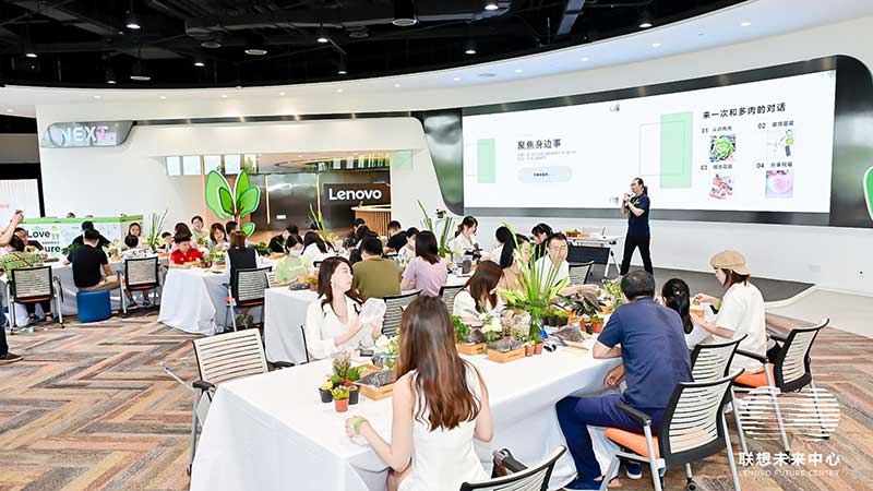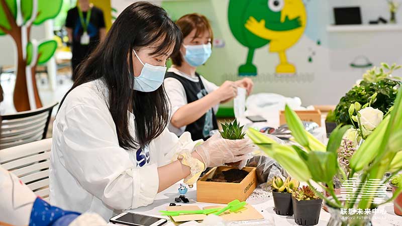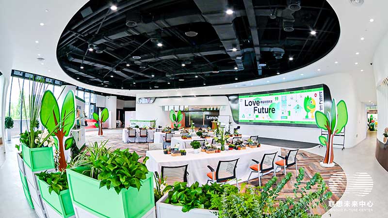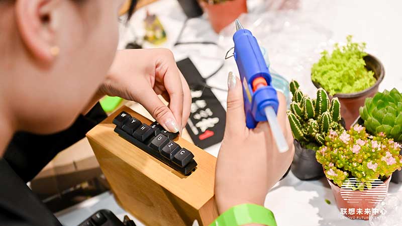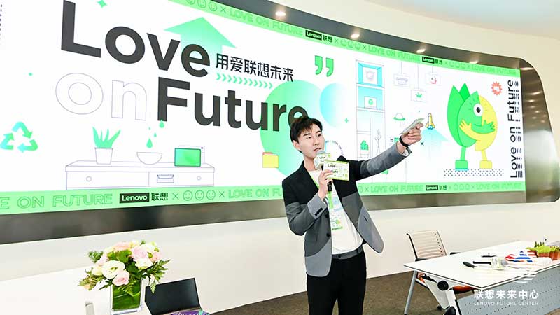 联想未来中心举行了Love on Future「以爱·置爱」公益拍卖会,现场布置了很多环保节能的打卡拍照点外,现场还提供不同颜色的丙烯颜料,可以自己用铅笔绘制图案,再涂色进行创意绘画。