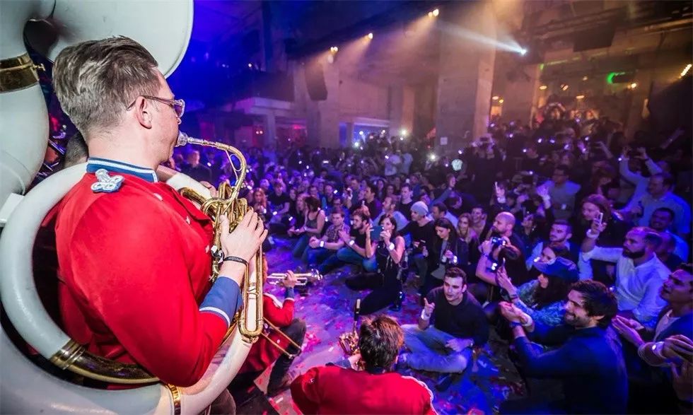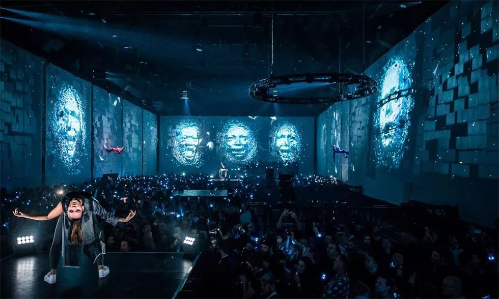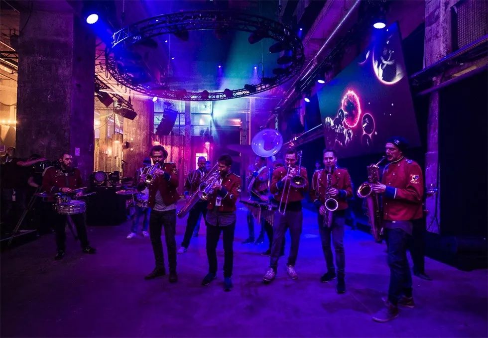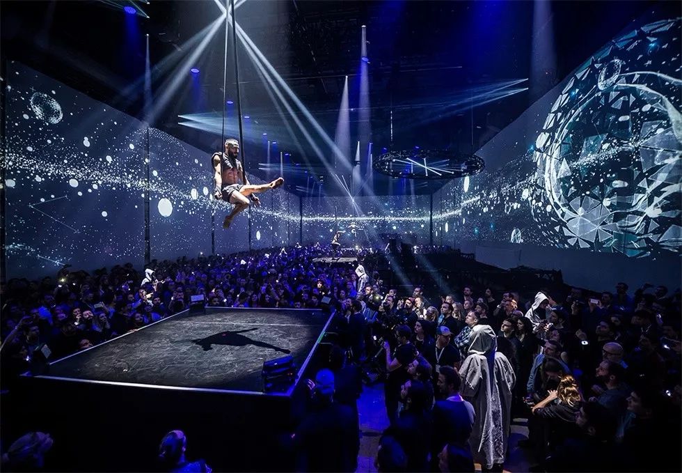 在柏林市中心的这个特殊场地,观众探索了许多以视觉、味觉和声音为主题的体验装置与活动。在这里可以吃鳄鱼奶酪三明治,喝一杯冰山鸡尾酒,同时在流行铜管乐队MEUTE的现场音乐伴奏下跳舞。在核心的活动区里,由16名表演者、舞者、高空杂技演员和20名歌手组成的演出团队在360度投影的环绕下,将观众带入到了另一个世界。另外现场像小罗德里格斯这样的知名音乐DJ们让派对一直持续到了凌晨。
