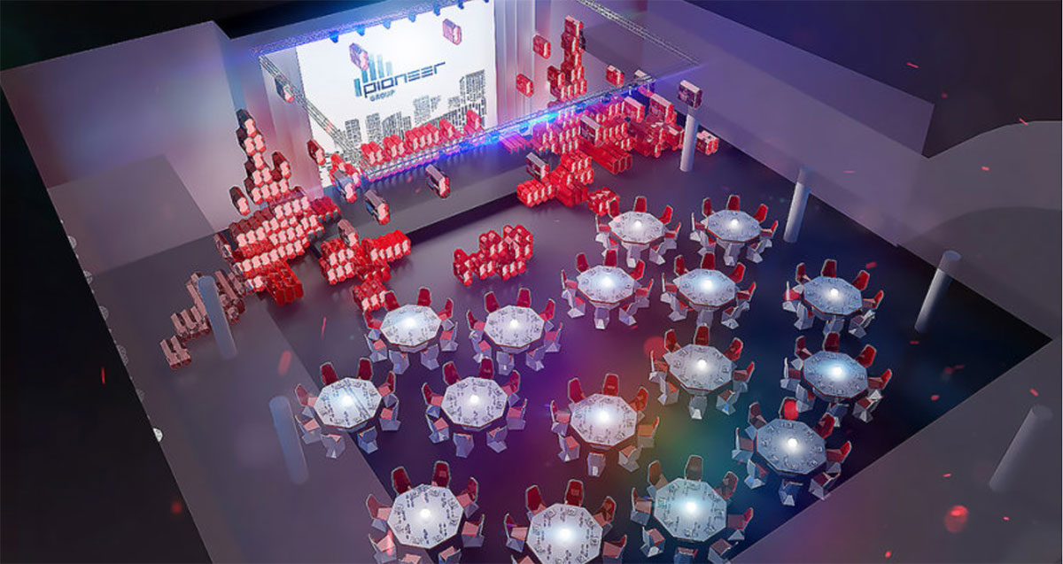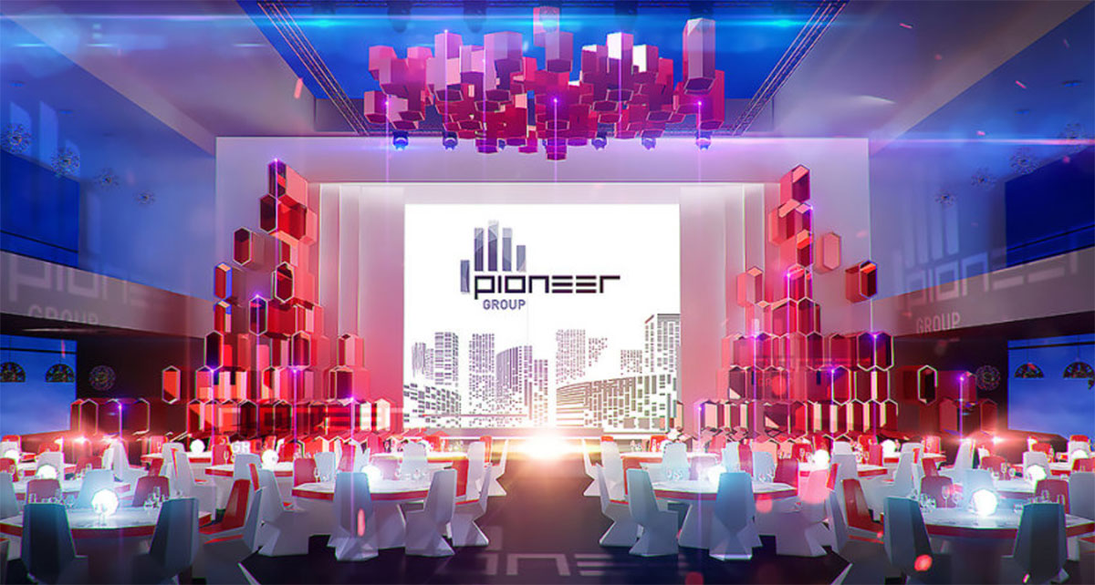 都说这是一场“蜂巢”的晚宴。活动现场采用蜂巢六边形元素位整个活动的设计创意点。舞台两边采用多个六边形不规则的叠加,舞台上方的也同样用多个不同尺寸的六边形做造型设计,就连餐桌也是按六边形设计的,将整个活动现场打造成一个“蜂巢”,用辛勤的小蜜蜂寓意在座宾客事业道路上的努力拼搏、兢兢业业。