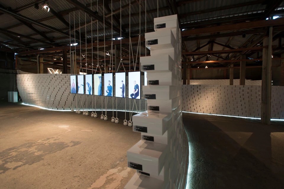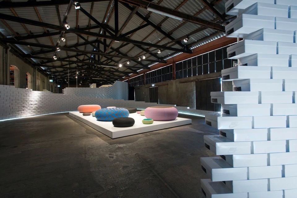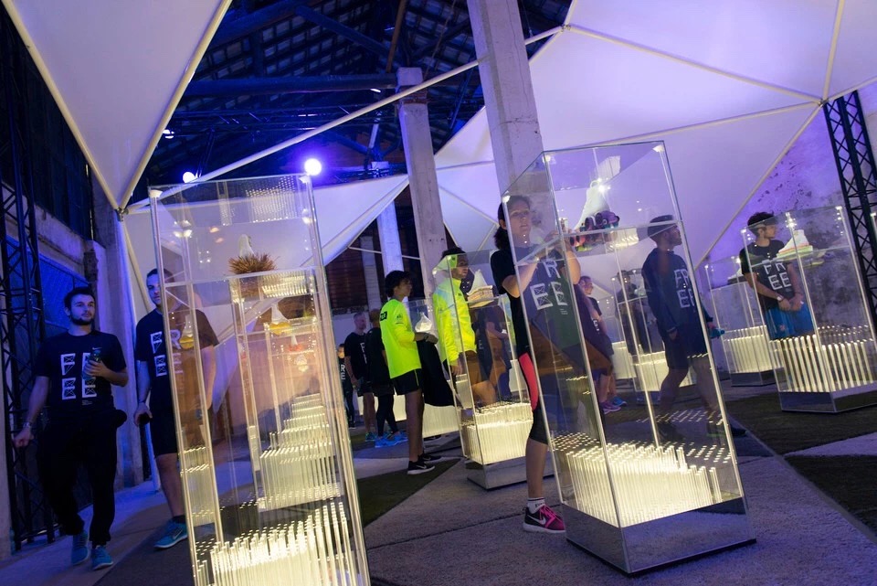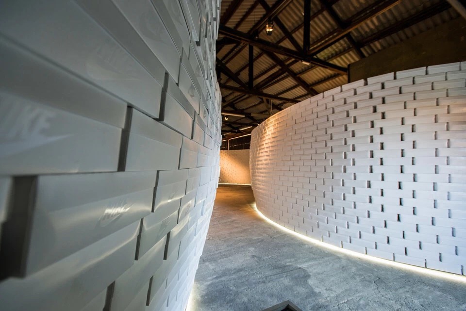 此次推广活动中一个令人印象深刻、富有创造性的设计元素,就是一堵由16000个白色鞋盒组成的200米长的墙,它将艺术家们的装置区域相互隔开。这个装置需要在现场临时搭建一堵200米长的墙,再由16000个白色耐克鞋盒组成,事先必须先用阻燃剂对鞋盒进行处理。
