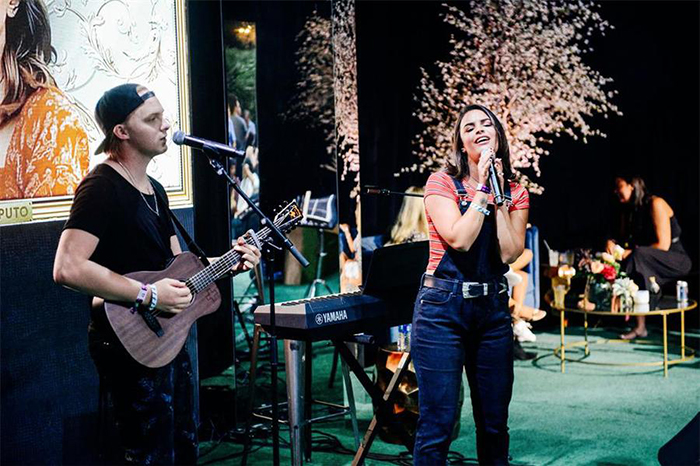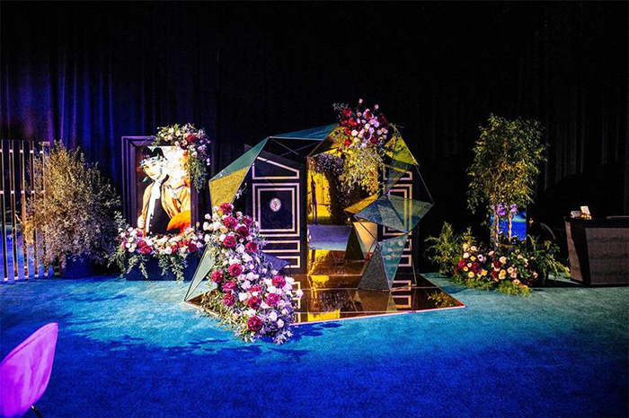 活动现场还使用亚克力金色板材和层叠的花饰制作了一个多面体结构,作为抽象的照相背景,而舞台上的一面LED墙则被设计用于现场表演的背景墙,整个休息区域集齐了休息与观赏的功能,让人一进入这里就彻底忘记了展会的喧嚣和繁杂,压根就不想再离开这个梦境加入到展会的世俗。