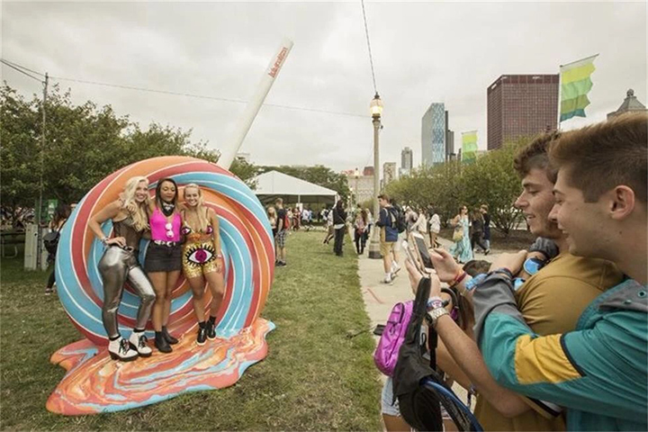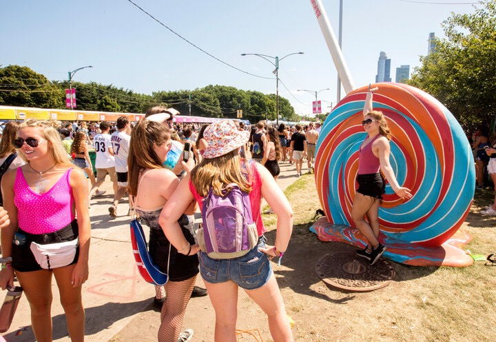 这个巨大的音乐节占格兰特公园一英里。除了节日的表演舞台和赞助商活动外,还有供客人拍照的道具,例如非凡音乐节的巨大非官方吉祥物的复制品:巨大的旋转棒棒糖。