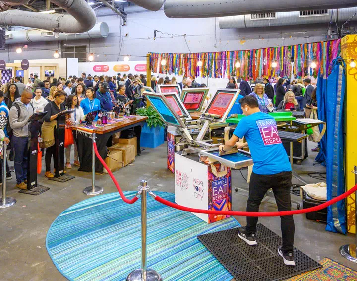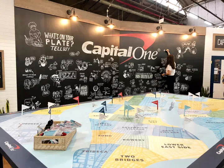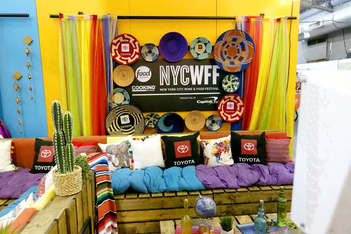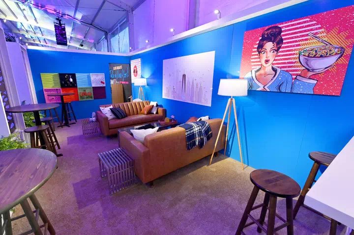 在猫王杜维斯(Elvis Duran)主持的开幕活动中,还设有一个休息室,休息室里有食物风格的波普艺术风格的艺术品和纽约天际线的插图。