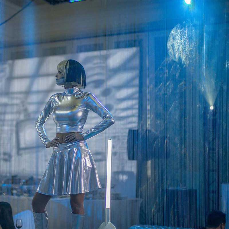 这些体现活动主题的模特不仅美,而且通过化妆师的手让她们每个人都有了独特的外表。杰出的化妆师将机器人元素和涂在男模特胸前的电路板结合在一起,并融合了代表未来主义的银色。在派对上,每一位模特就是一件活生生的艺术品,客人们争先与模特们合影已成为这场派对活动的一大亮点了。现场的活动装饰元素让现场充满了未来主义的环境氛围,而这些模特让这场未来风格的派对真正拥有了灵魂,使这一活动令人难忘,它是一个意想不到的元素,真正的独一无二体验。