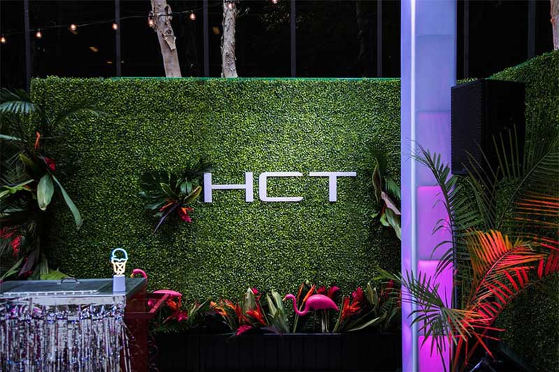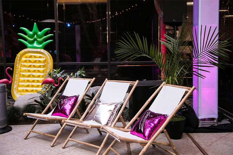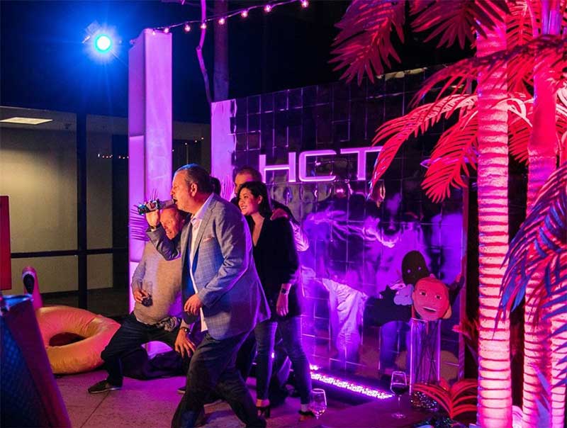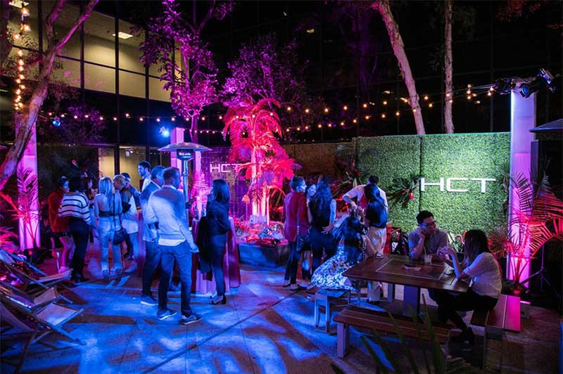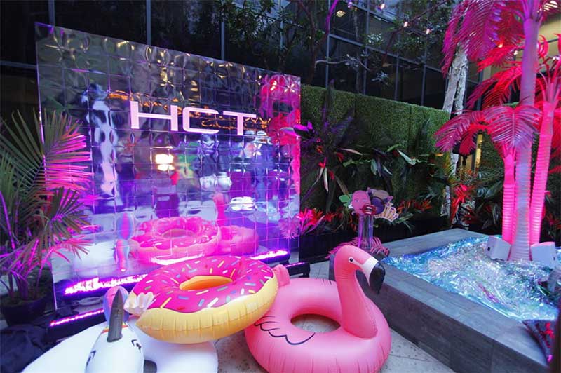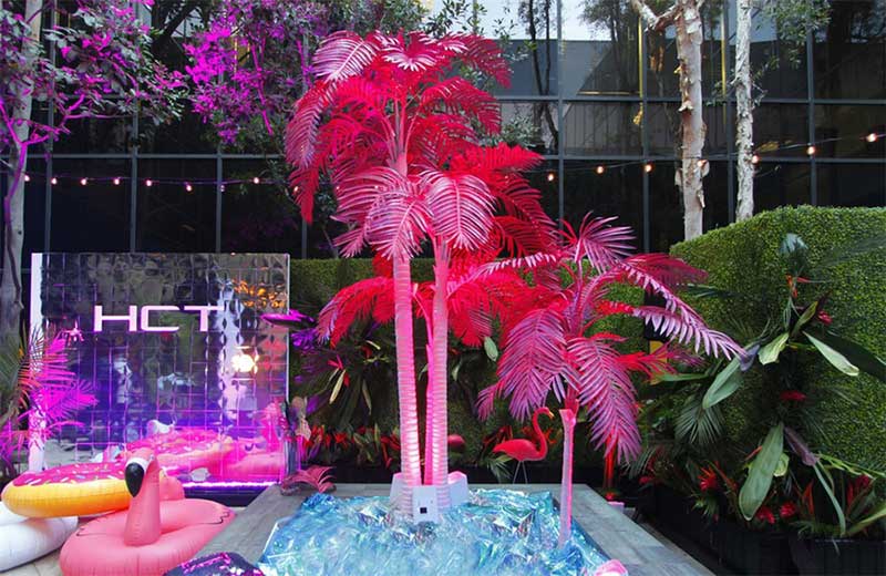HCT集团在他们洛杉矶圣塔.莫尼卡公司产品陈列区举行了B2B派对,并将其活动现场改造成洛杉矶主题的海滩公园。而现场引人注目的装饰元素包括巨大的粉红色棕榈树,超大泳池充气装饰的室外休息区、冰淇淋车和反光的未来主义风格的照相墙,五彩缤纷的材料、霓虹色的格调以及热带植物,都是客人们最爱的夏日鸡尾酒派对。