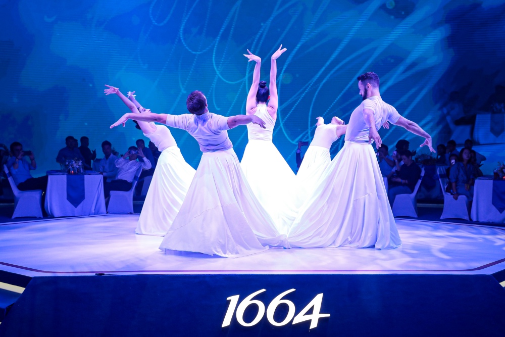 夜幕降临之际,于阵阵轻柔空灵的手碟击打乐声中,#1664法蓝晚宴#优雅揭幕,来宾们均优雅端坐于席位,品尝1664。在360度环屏带来的强烈冲击与刚柔并济的现代舞蹈中,享受法式艺术的视听盛宴。精彩的表演过后,嘉士伯中国区国际品牌市场总监Priya Sharma女士也上台为今晚的#1664法蓝晚宴#致辞。