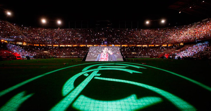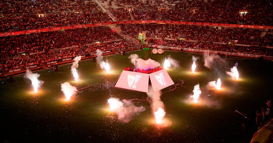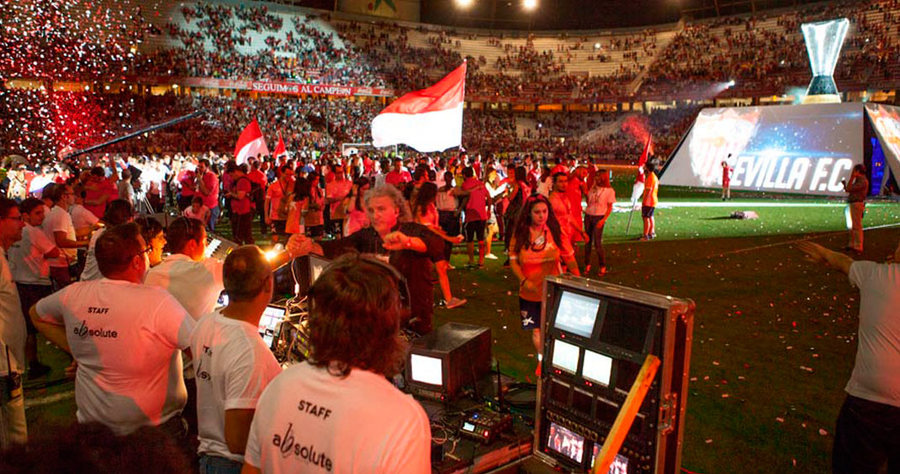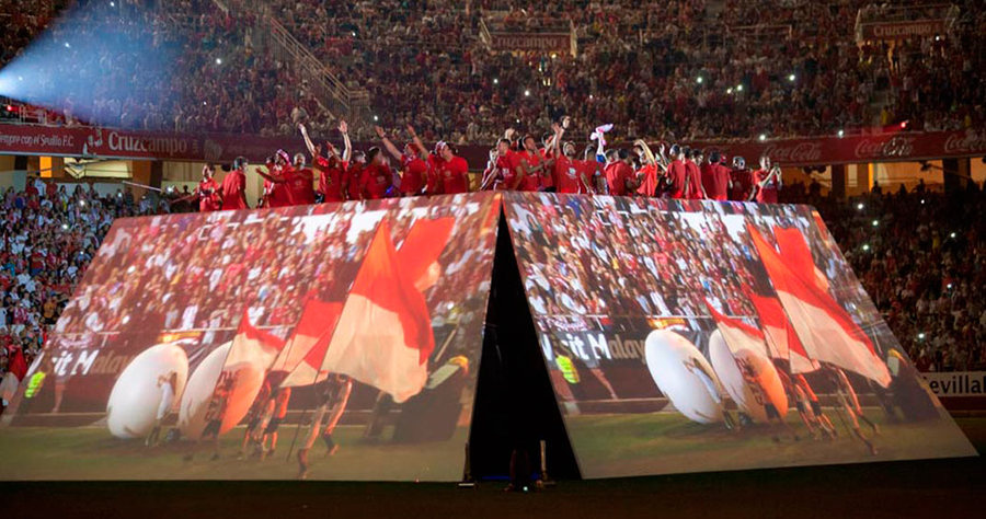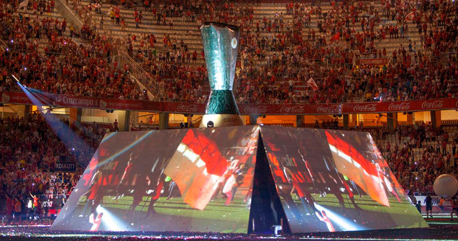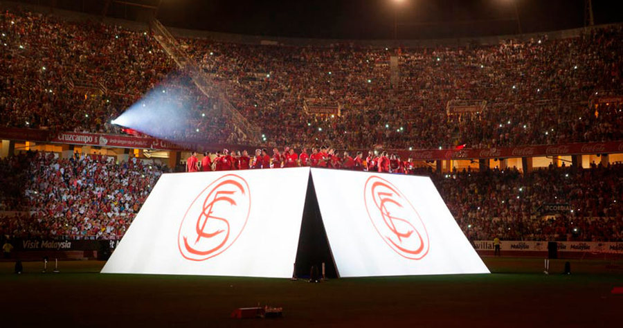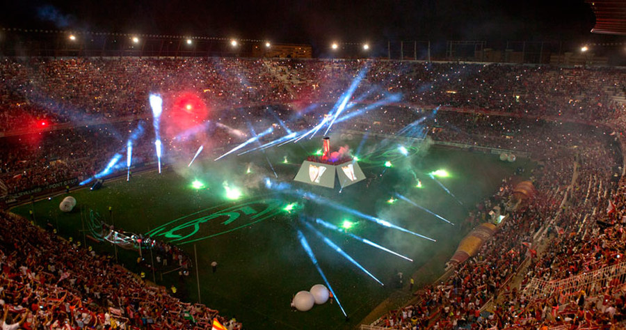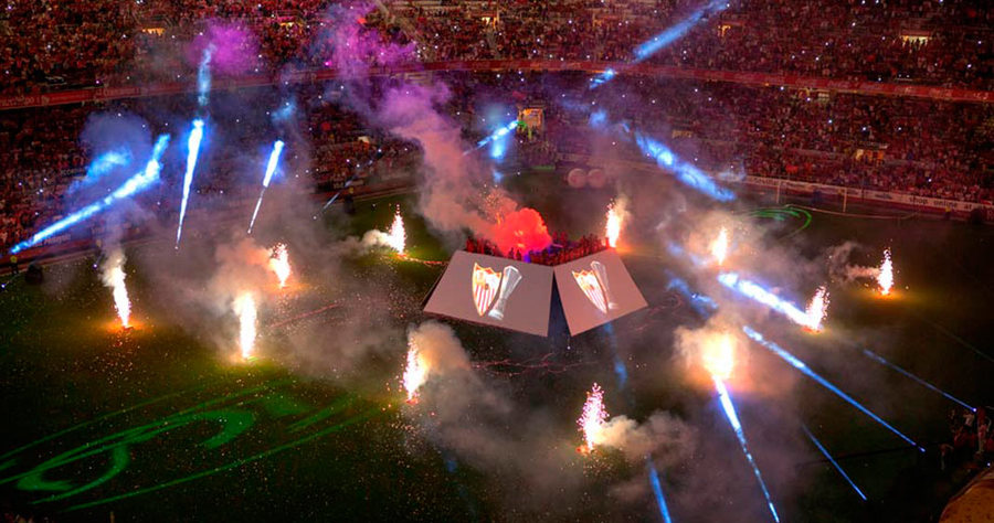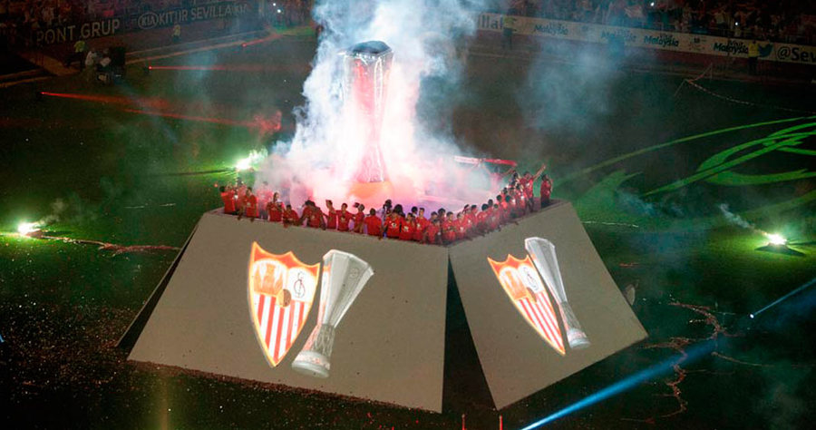 塞维利亚足球俱乐部是西甲传统劲旅,在西班牙全国性的足球比赛开始之前,塞维利亚曾经赢得17座安达鲁西亚锦标赛,以及2次获得塞维利亚市的冠军。在西甲联赛成立后乃塞维利亚全盛时期,虽然只曾于1946年赢过一届冠军,但大部分时都在联赛榜前列,赢过4届西甲联赛亚军。此次塞维利亚足球俱乐部第五次赢得欧洲联赛冠军庆祝活动,在拉蒙桑切斯皮斯胡安球场中间搭建了一个8×8米的舞台,4个12 x5m的梯形屏幕和一个5米的联盟杯,这样特殊的舞美设计掀起活动现场观众们的阵阵欢呼,当晚都嗨翻天燃到爆!
