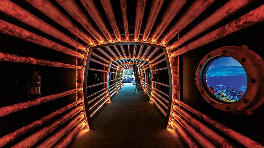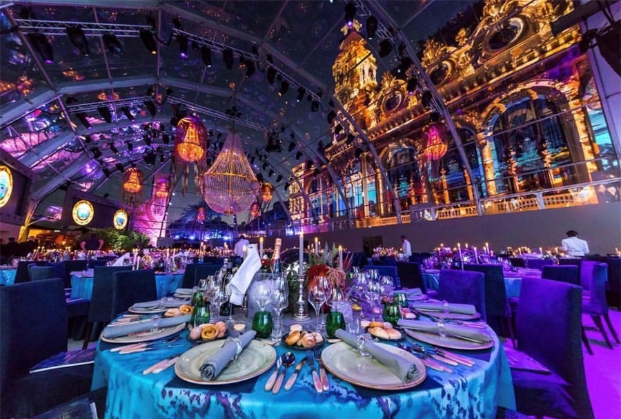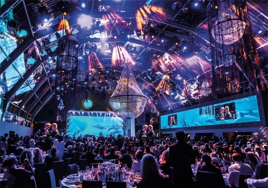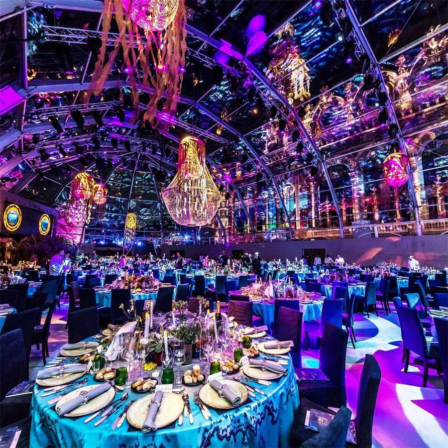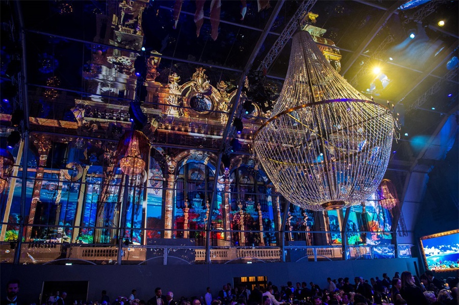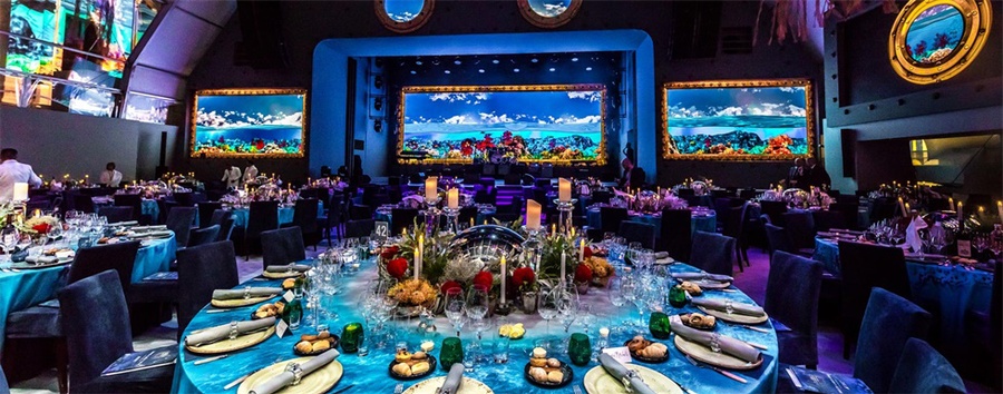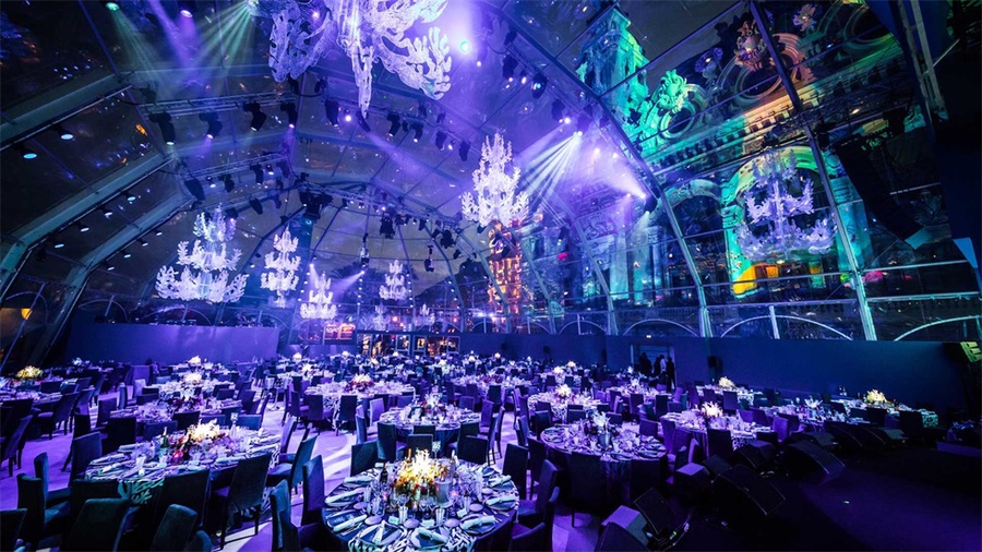 活动现场的设计风格是海底风格,连接派对区与宴会区的通道被设计成了老式船舱的风格,通道上还陈列着各种珍贵的拍卖品。客人穿过通道,进入透明帐篷下的宴会大厅,在这里帐篷一侧的墙面被设计成了圆形的海船上的窗户,窗户外是海底的世界,帐篷顶部的吊灯上挂着垂吊的纱幔,看起来像来自海底的水母,客人们仿佛置身于是一个巨大的水下船舱内。