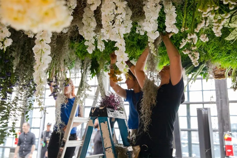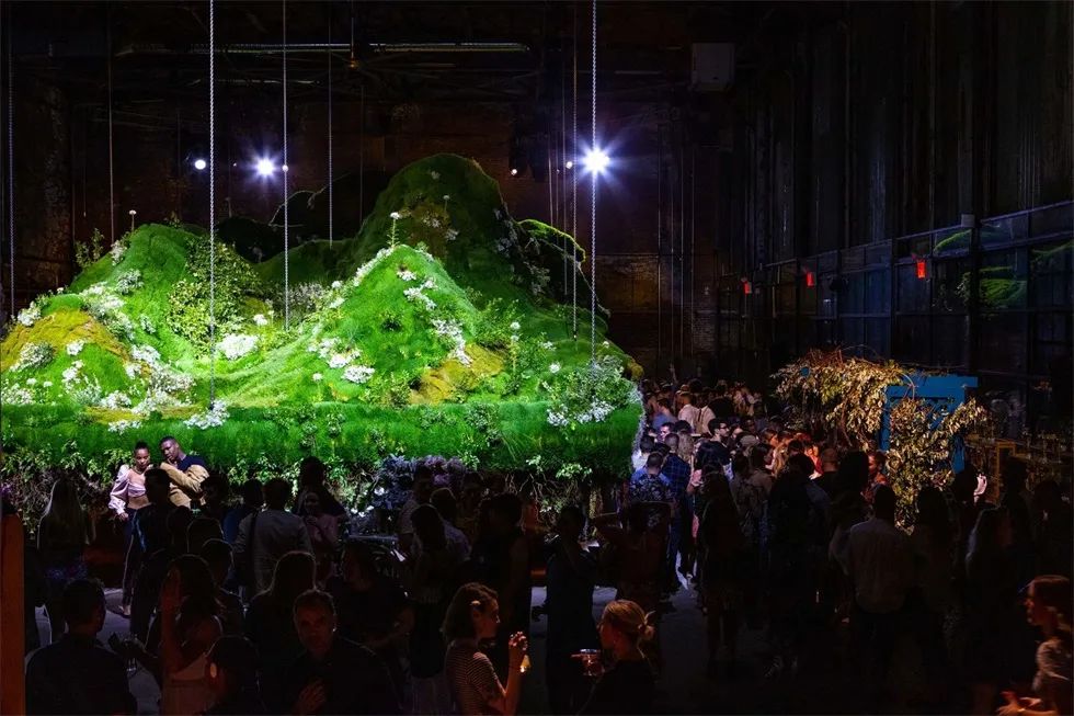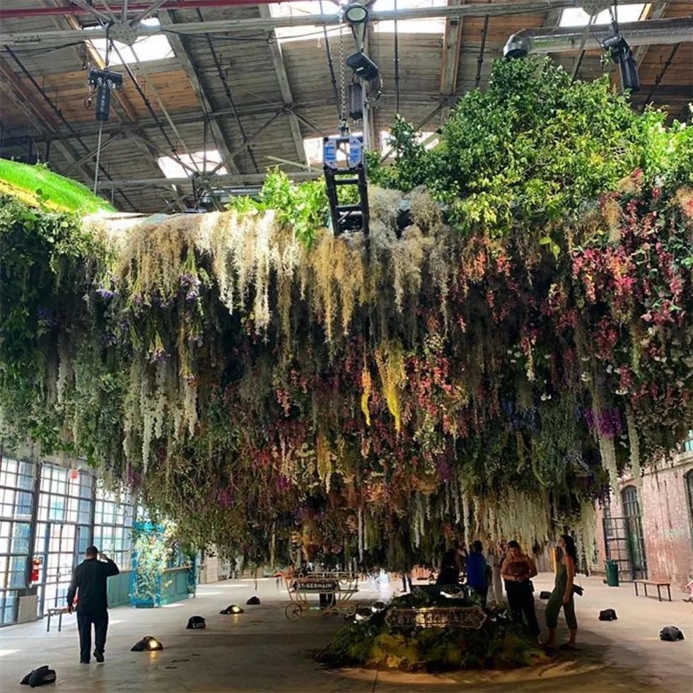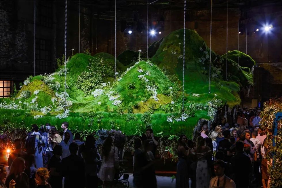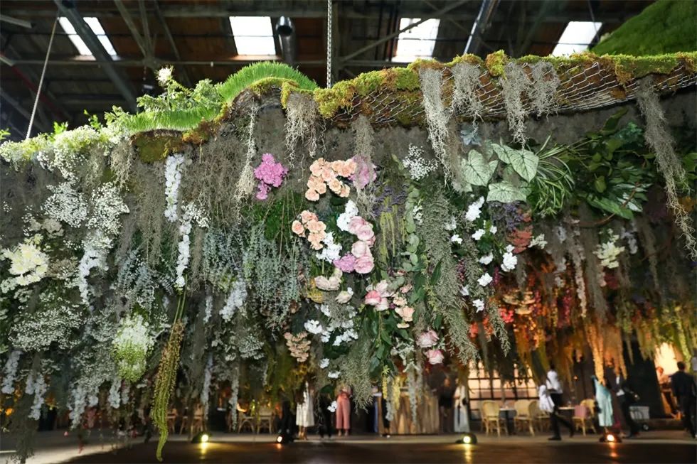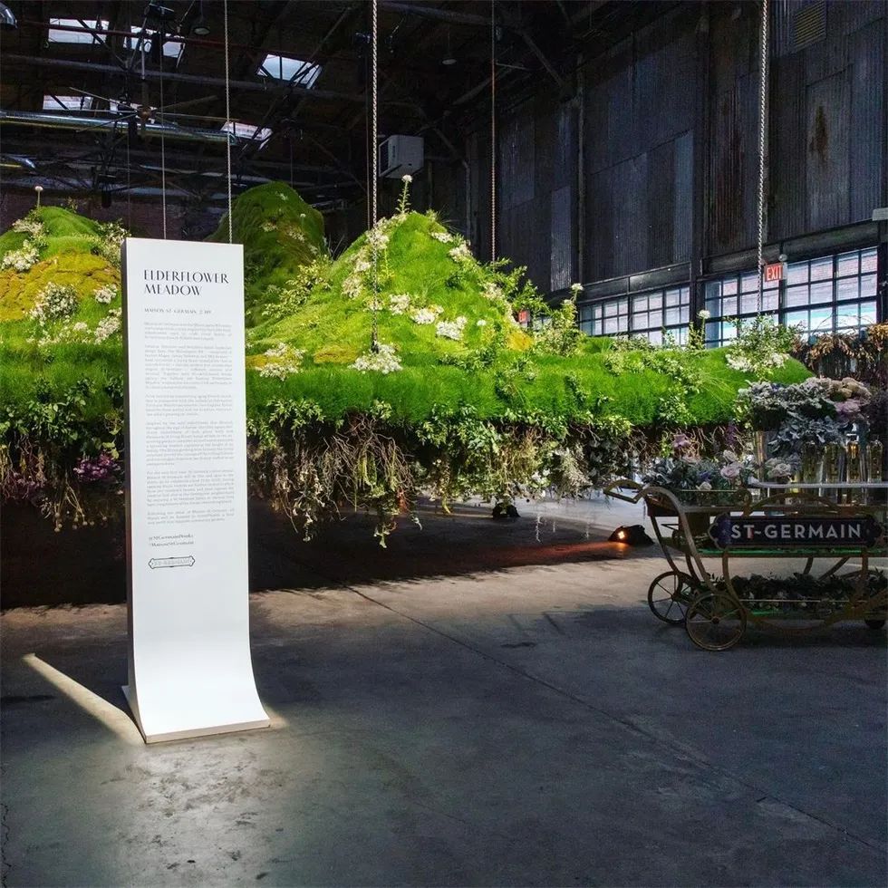 这个重达12吨的“接骨木花草甸”装置占地111平方米,几乎是整个仓库的长度,并有1000朵接骨木花,这凸显了圣日耳曼酒庄的口号:每瓶中含有1000朵接骨木花。这个装置由起伏的绿色山丘和数千朵倒插的鲜花组成,并被悬挂在12米高的空中。这是前两届活动现场装置的升级版本。