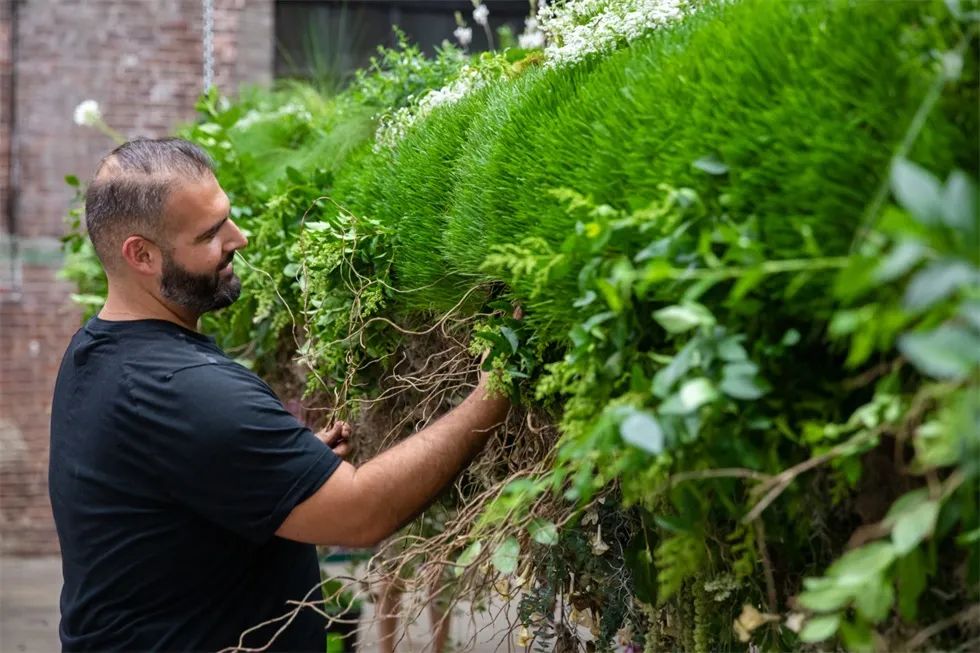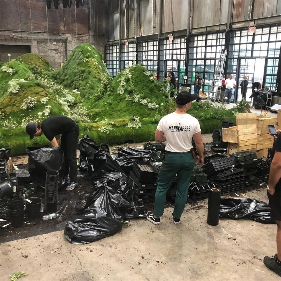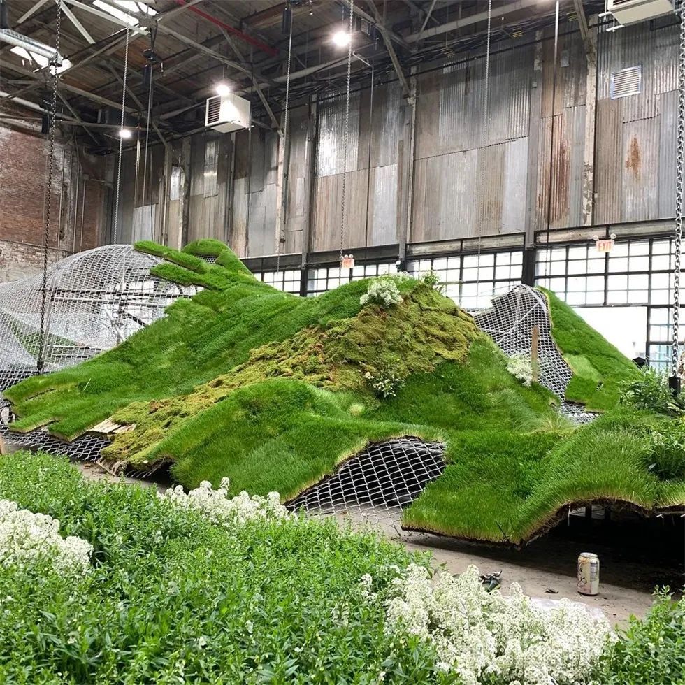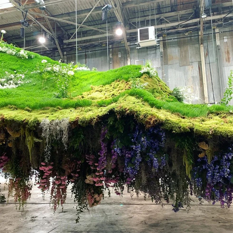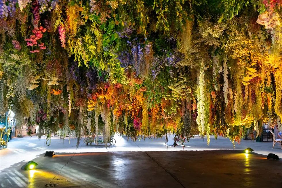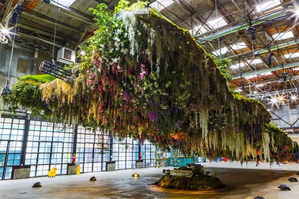 这个重达12吨的“接骨木花草甸”装置占地111平方米,几乎是整个仓库的长度,并有1000朵接骨木花,这凸显了圣日耳曼酒庄的口号:每瓶中含有1000朵接骨木花。这个装置由起伏的绿色山丘和数千朵倒插的鲜花组成,并被悬挂在12米高的空中。这是前两届活动现场装置的升级版本。