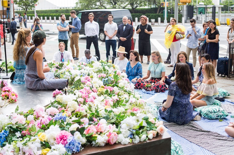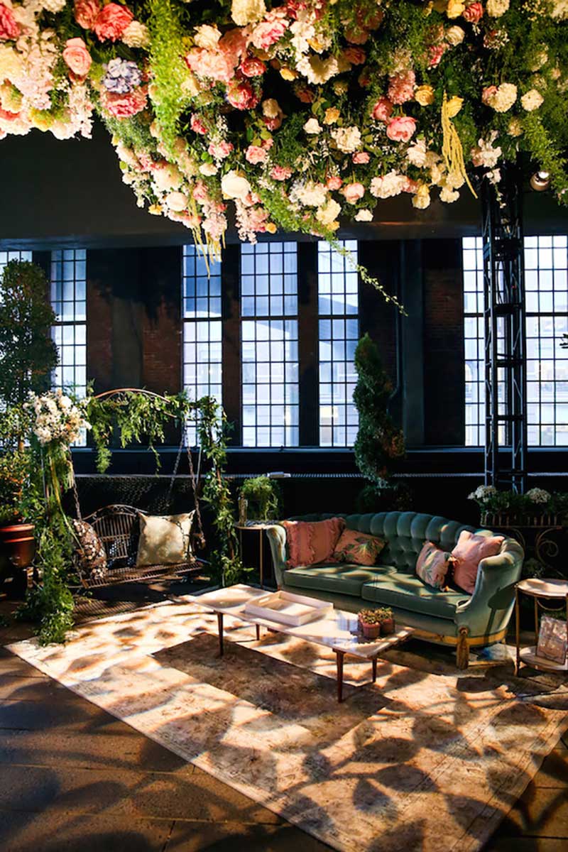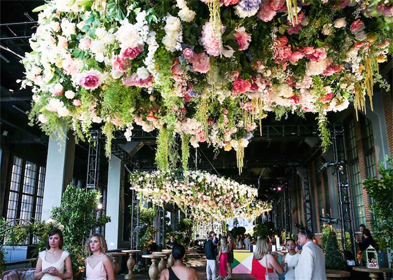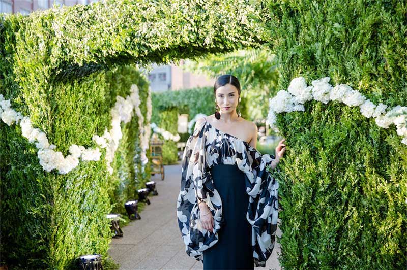 现场郁郁葱葱、色彩斑斓的植物构成的完美氛围,是由布鲁克林的布景设计师莉莉设计,她因在路易威登迈阿密设计区、纽约植物园、美国森林再造林计划以及迈耶特(Maiyet)、耐克(Nike)和H&M等品牌的作品而闻名。