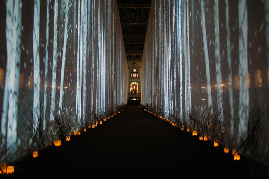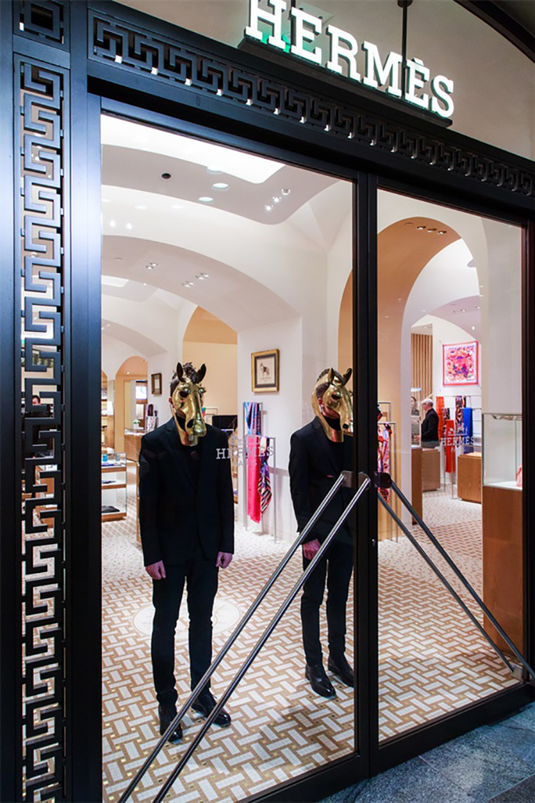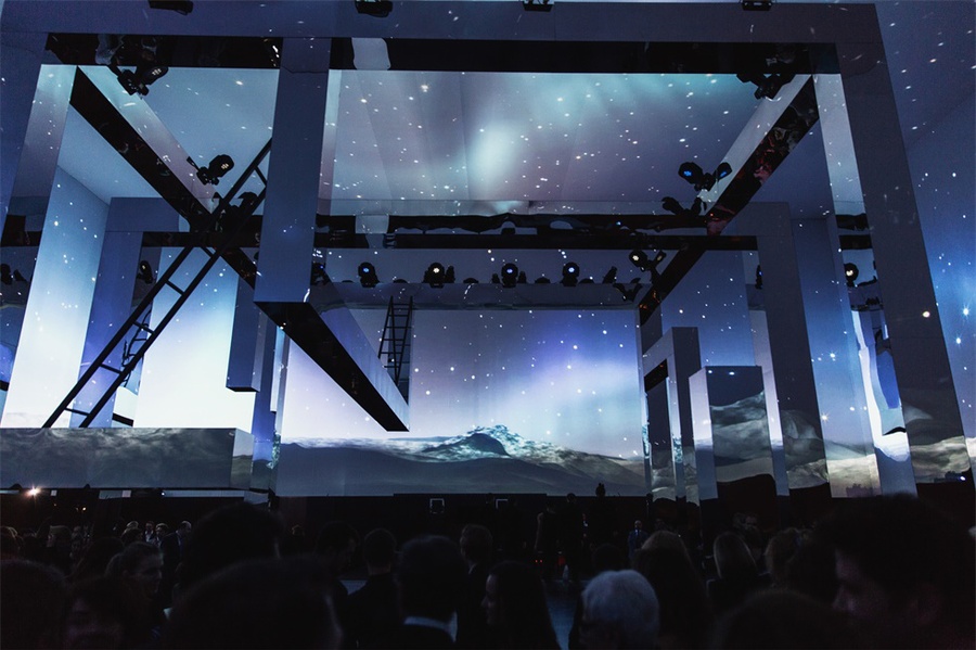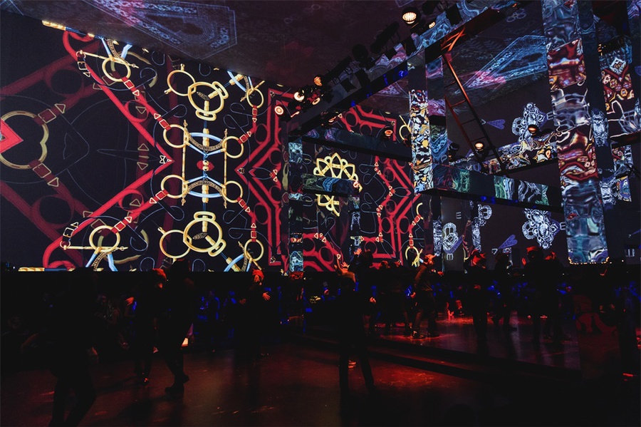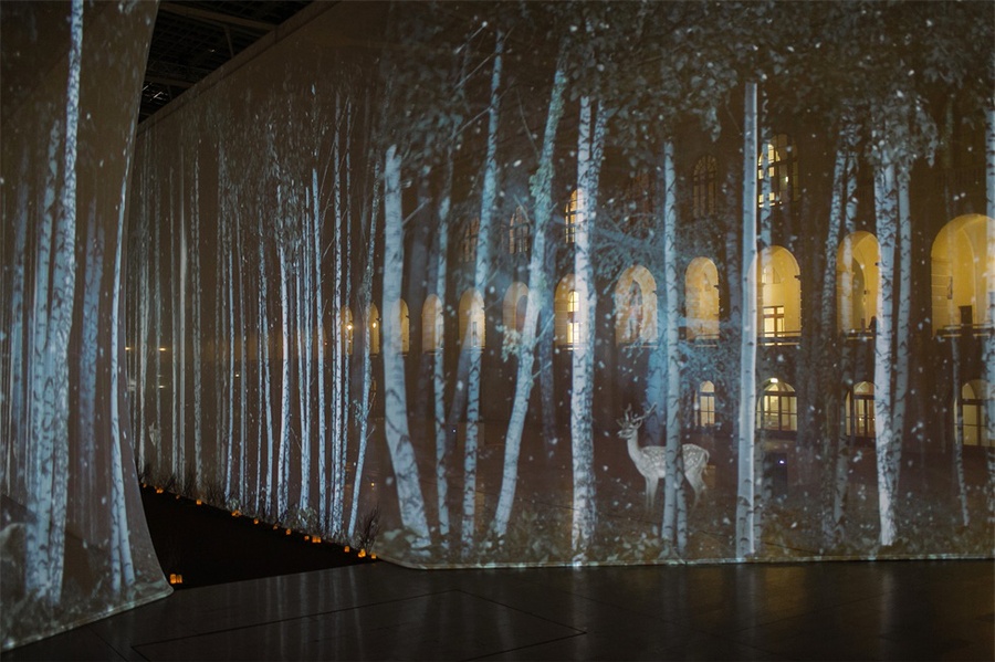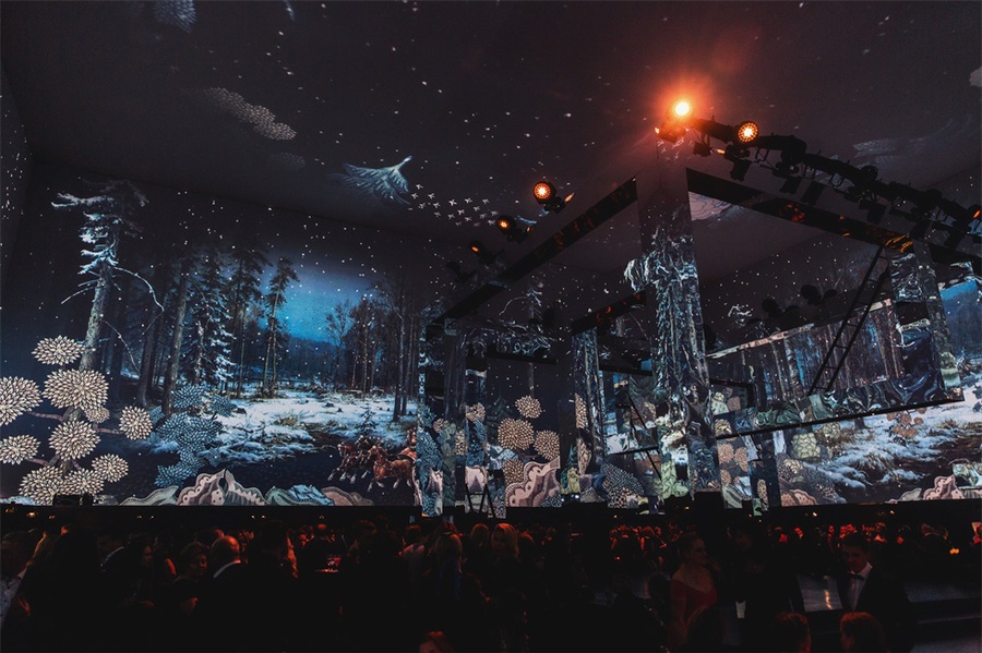 爱马仕(Hermes)旗舰店在莫斯科古姆(GUM)百货商店开业后,又在莫斯科著名的Gostiny Dvor展览中心举办了一场600名宾客参加的派对。客人们仿佛进入了一个魔法森林,在一个巨大的画廊里,冬天的桦树被投射在墙上,戴着森林动物面具的演员们欢迎他们的到来。派对本身是在一个巨大的立方体内举行的,而这个立方体的墙壁和天花板,反过来,变成了一个华丽的“森林”视频映射投影的画布。鸡尾酒会一场现代舞蹈,音乐秀和DJ秀的现场举行。