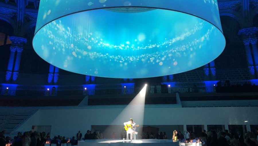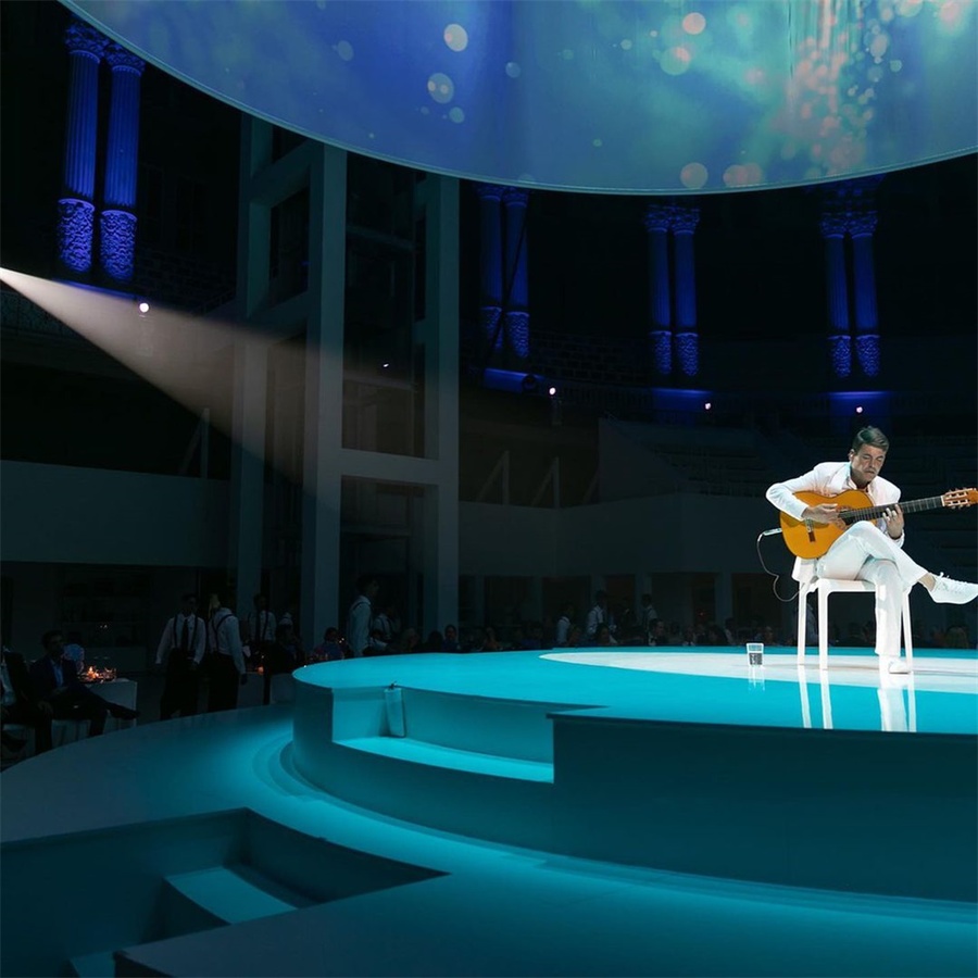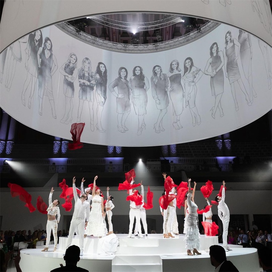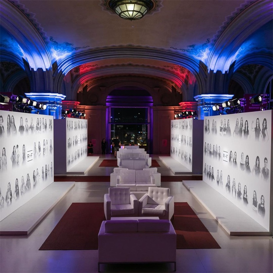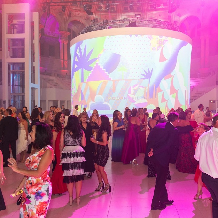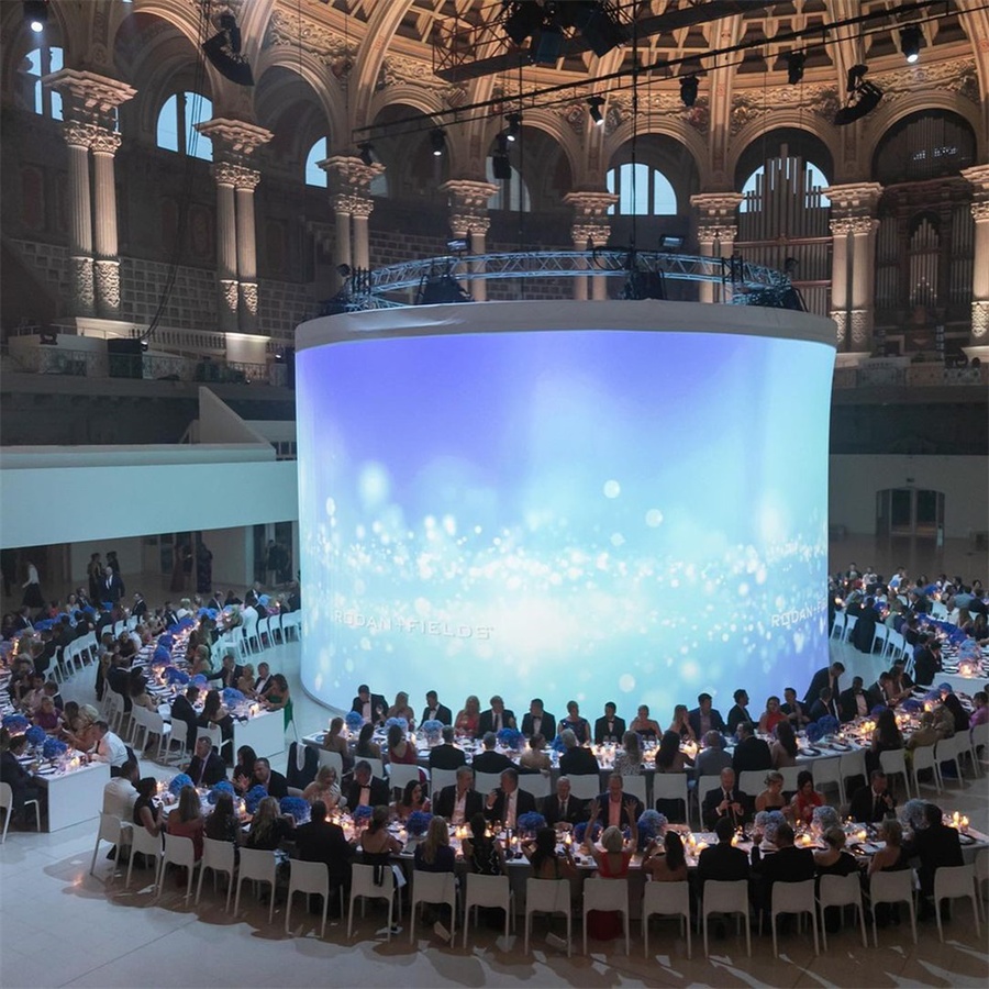 Rodan & Fields(罗丹&菲尔德)在西班牙的巴塞罗那为参加罗丹&菲尔德环球旅行的客人们举行了一场告别晚宴。现场设计了圆形的四面舞台,餐桌围绕舞台布置,舞台上方一个巨大的圆柱形幕布笼罩着中心舞台,投影机投射巨大的图像与动态视频在圆形幕布上,当表演开始时,圆形幕布缓缓升起,露出中心舞台与表演者。这样的设计为参加晚宴的客人带来耳目一新的视觉效果,独特的舞美设计让参与人获得一种独特的晚宴体验将会加深对品牌的印象。