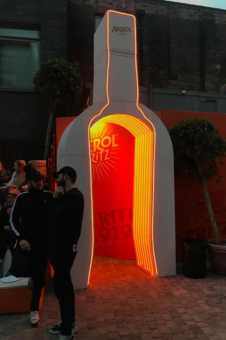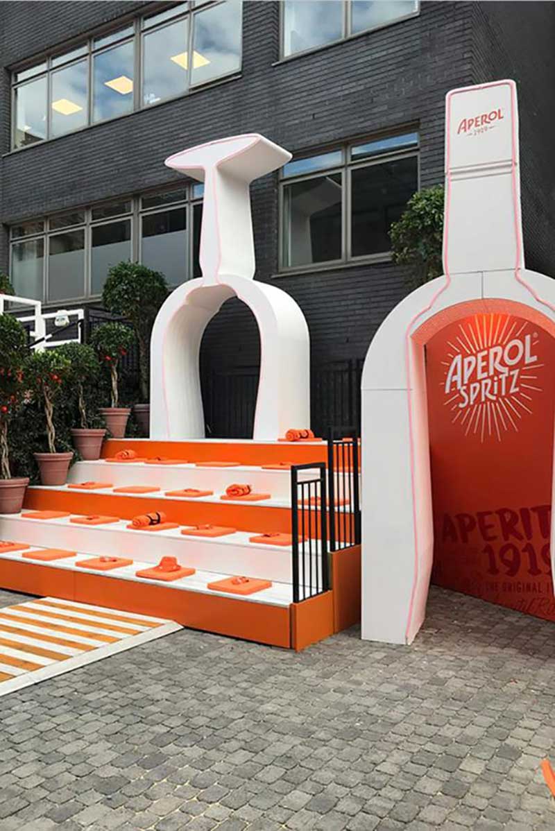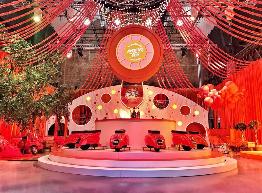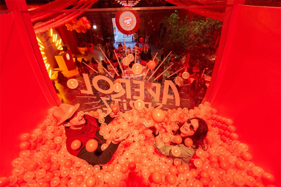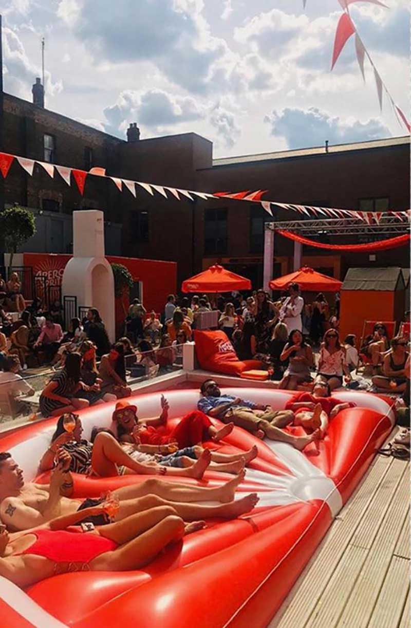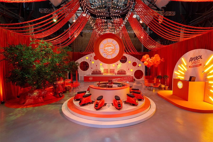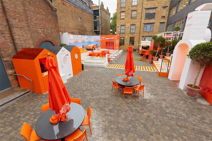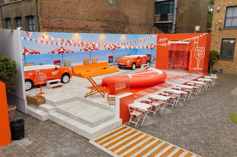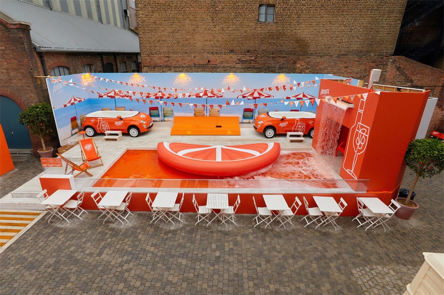 阿贝罗开胃酒在霍克顿广场的旧电灯站举行活动,为客人们带来了一次难忘的消费者体验。在这个满是橙黄的品牌色世界之中,设计了流动的橙色瀑布,倾斜的“水岸”,客人们沉浸在充满活力的漩涡浅水中清凉他们的脚趾或简单地漂浮在一个橙色充气物上,而其中一个受欢迎的是定制的经典意大利汽车外形的热水浴缸。在活动现场的室内部分里面有一个巨大的阿贝罗鸡尾酒形状的泡泡球池和英国第一个旋转木马吧台,还有气泡隔间和悬挂式秋千。