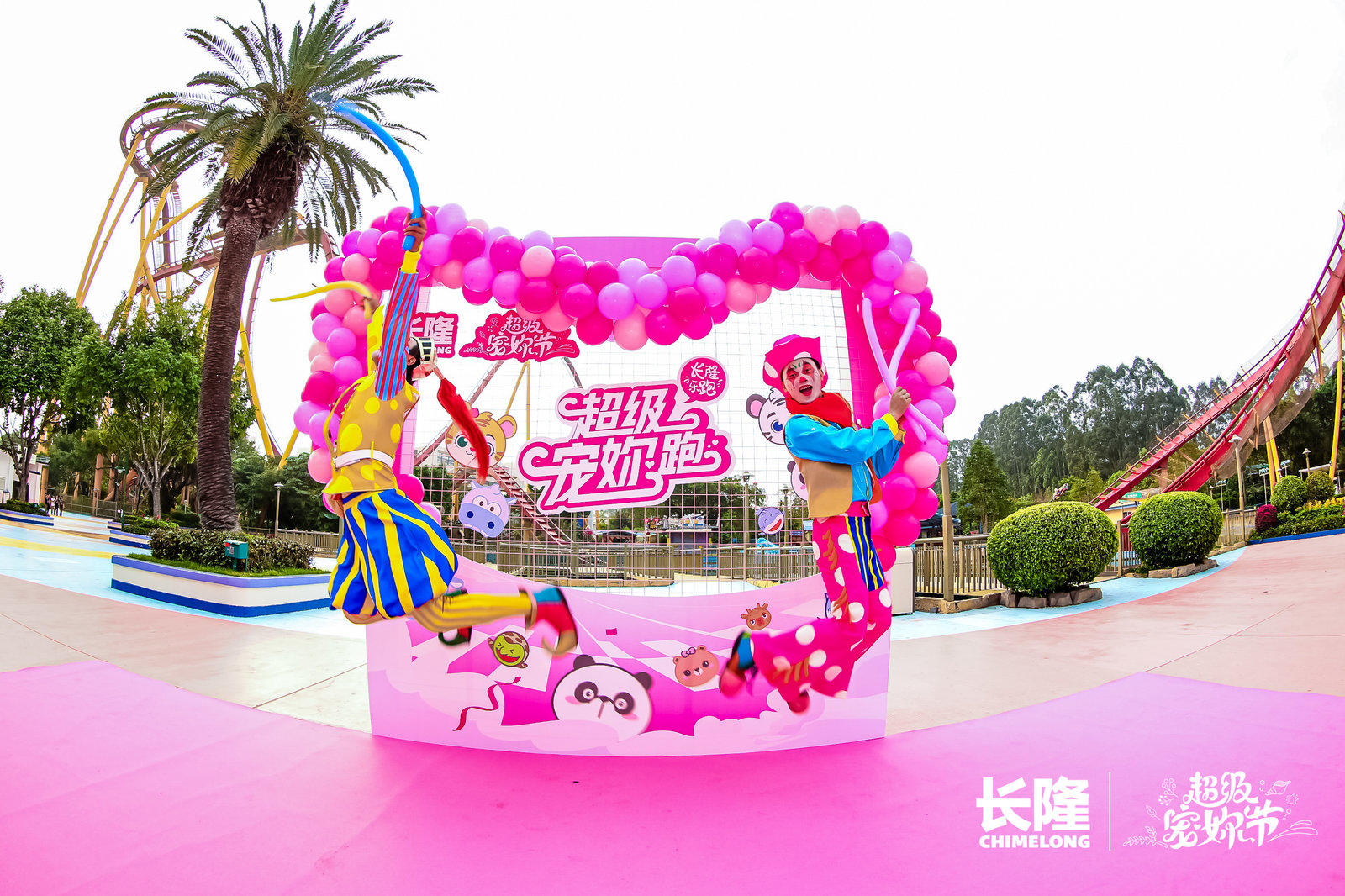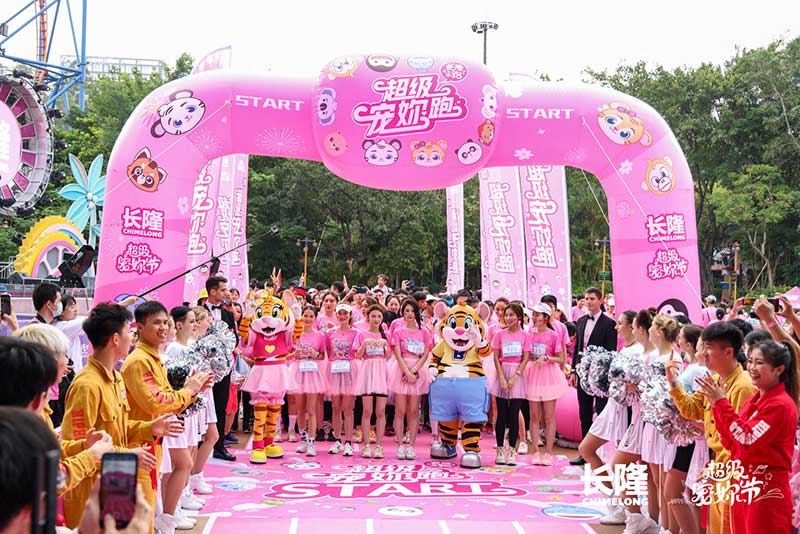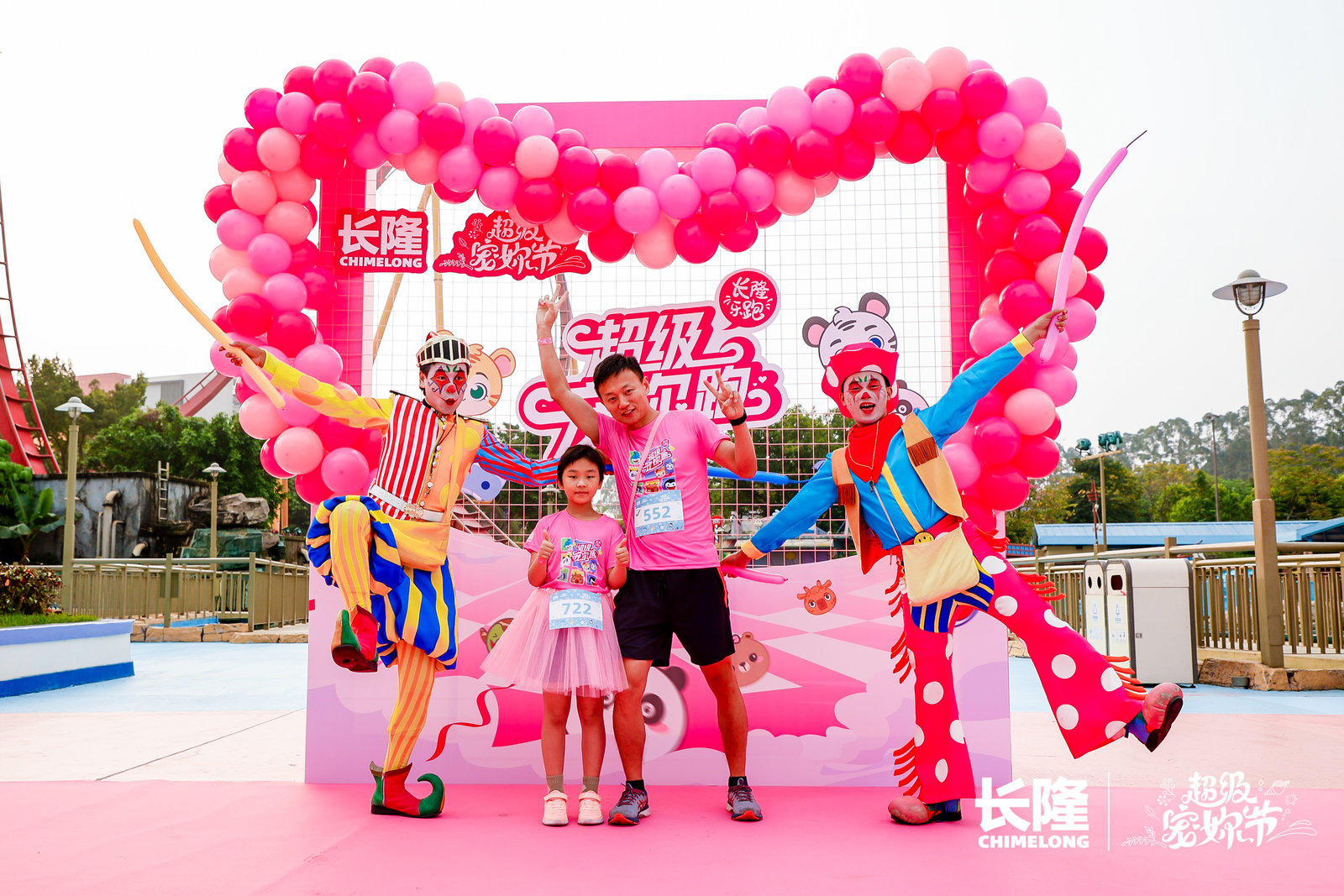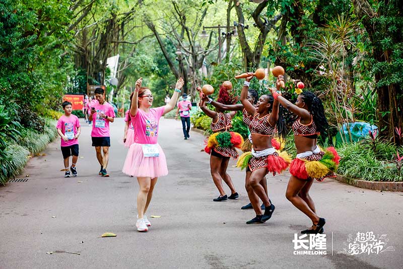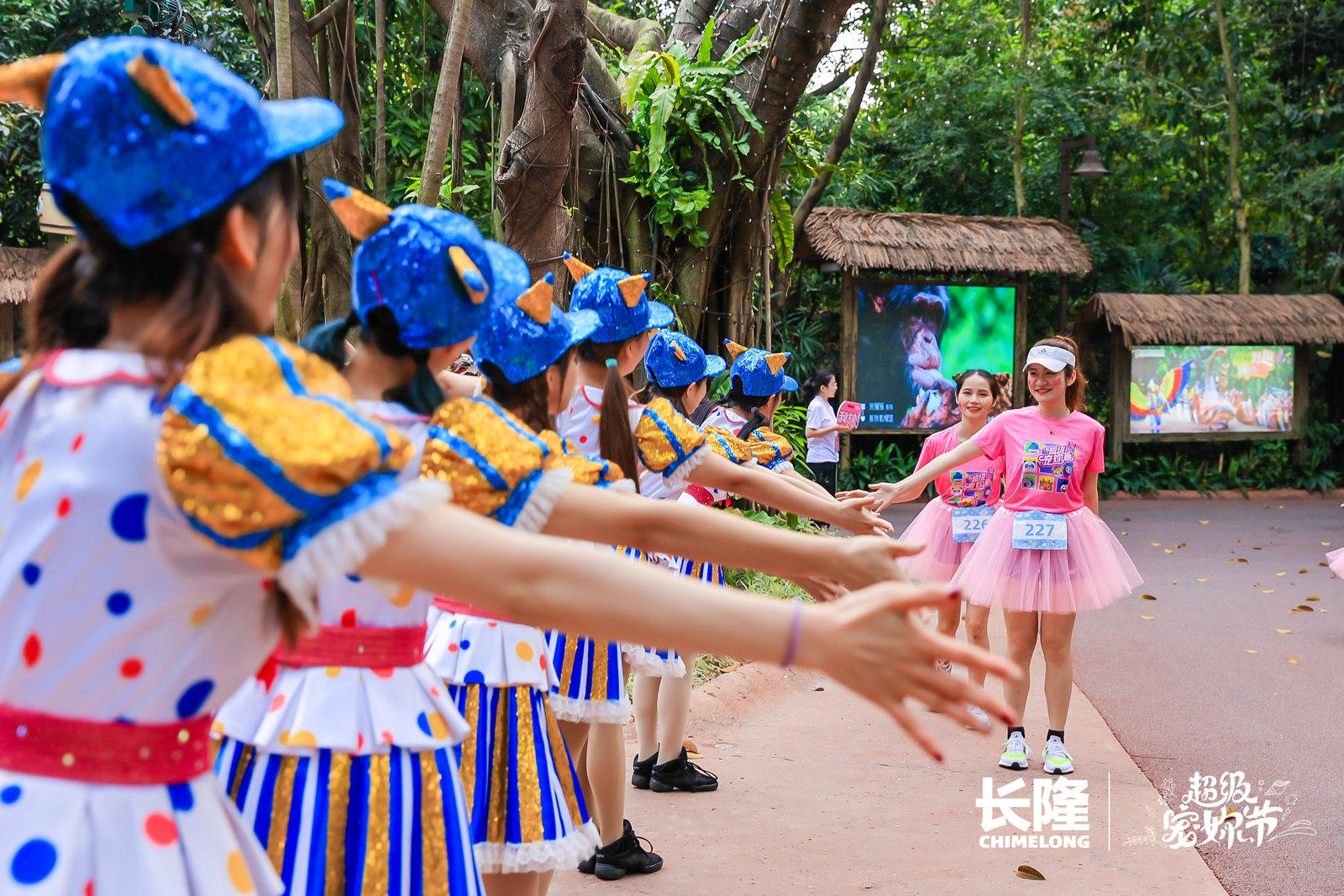 此次长隆超级宠妳跑,跑友们早早就来到现场,准备好各种跑步装备,做好热身运动,期待开跑一刻。主办方特意为参跑者提供了卖萌“神器”——“粉色纱裙”。一众女神们对该卖萌“神器”爱不惜手,兴奋得连连尖叫,当大家将粉色纱裙穿在身上后,尽显“萌”力四射。更有趣的是,有参与活动的跑男们,也抵受不住“粉红”萌力,纷纷换上粉色纱裙,汇入粉色海洋。超级宠妳跑广州站路线以长隆欢乐世界中心演艺广场大舞台为出发点,开跑前,超级男团和女团为各位参跑选手献上劲歌热舞表演加油打call,奏响“宠妳开跑”的号角。长隆的“万人迷”卡卡、琦琦还在舞台上领舞,近千人合跳长隆牛牛舞。