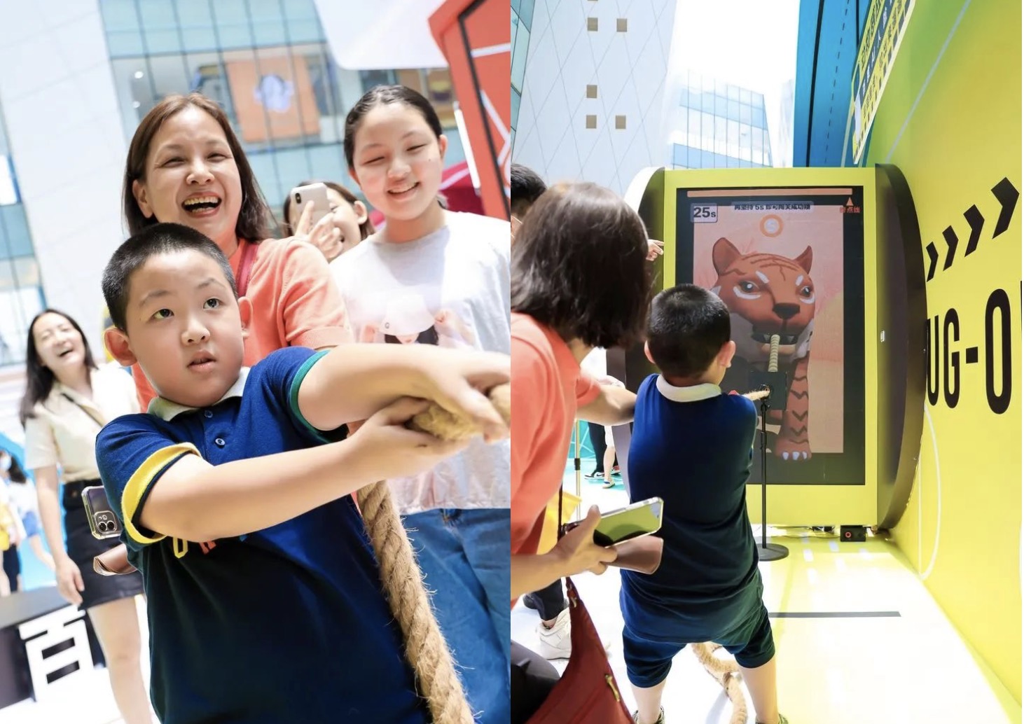 “不眨眼马拉松”AI体验互动区,考验智慧与灵敏。通过保持不眨眼让小度熊向前跑,同时说出“小度”让小度熊跨过障碍。边睁眼边张嘴,边狂跑边跨栏,体育老师见也得说一声瑞思拜。“脑力大擂台”AI体验互动区,需要团结与协作。“空气跳绳”AI体验互动区,看谁有速度与热情,脸和脑子都用过了,现在该拼下半身了,跟着虚拟跳绳的节奏跳起来,跳着跳着就和小度熊一起跳出地球了。“动物感应拔河赛” AI体验互动区,最需要力量与勇气。玩归玩,既然是竞技,还是得计分——参加每项比赛前出示个人专属二维码,结束后比赛成绩就会自动记录,最后凭总成绩在AI领奖台领奖,并查看五种精神力得分。