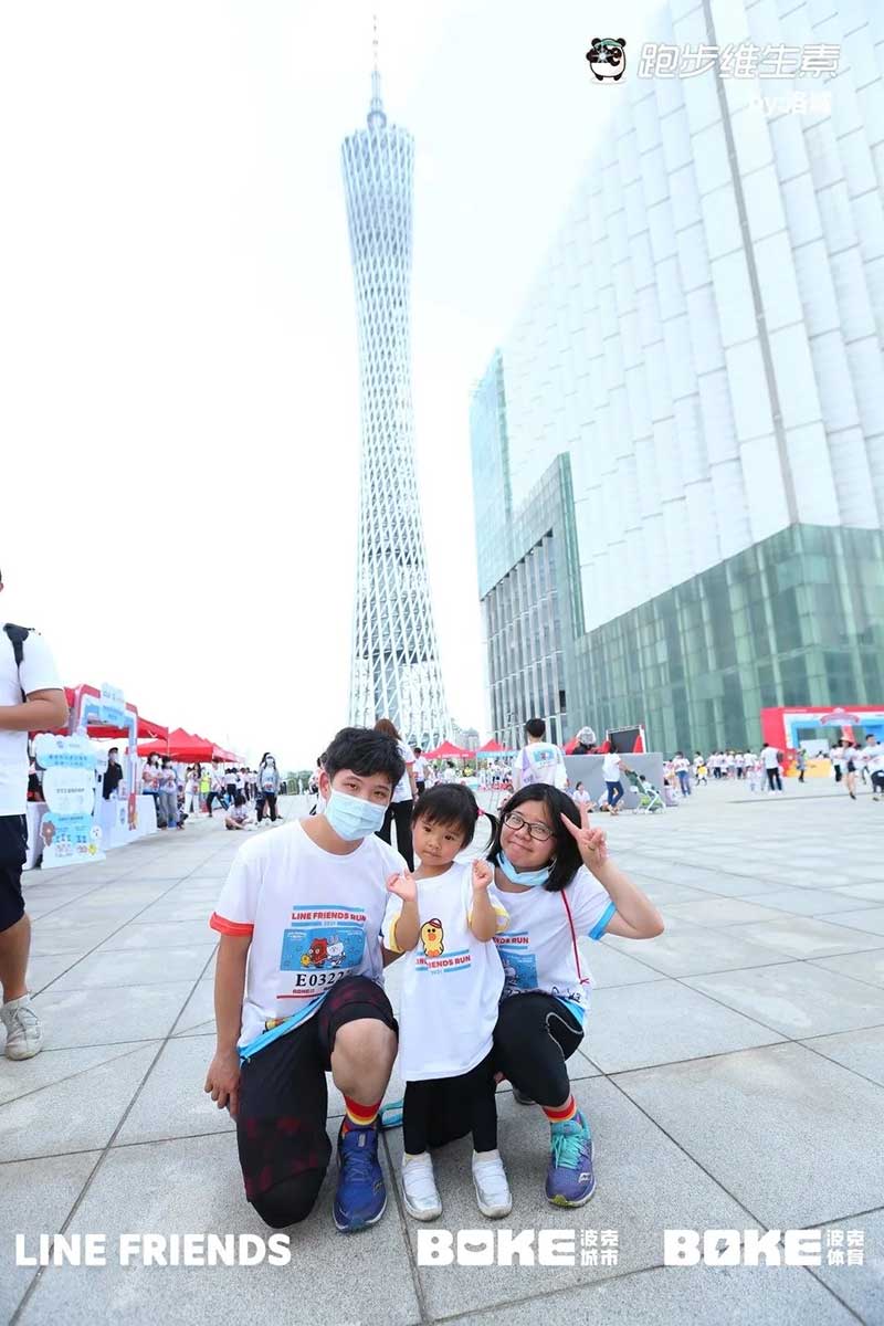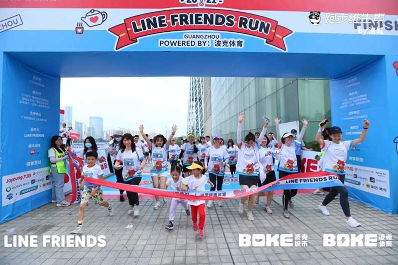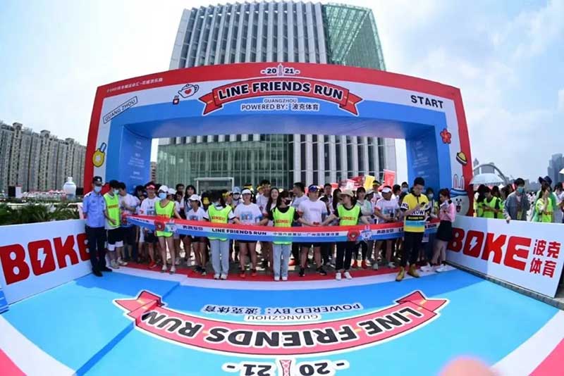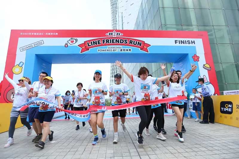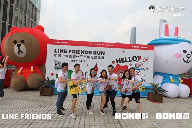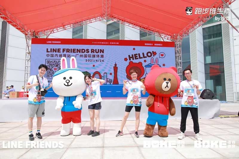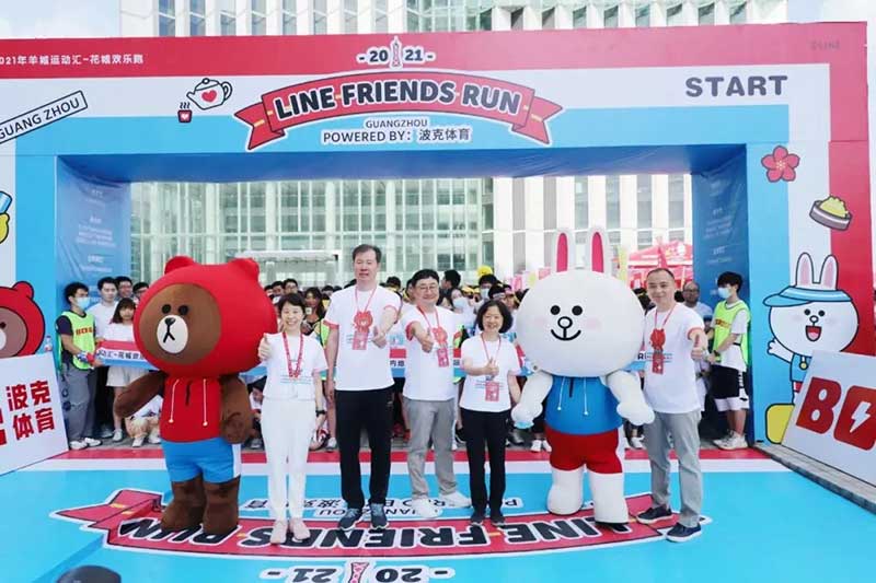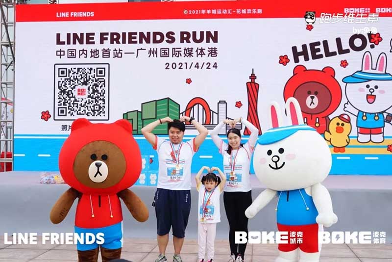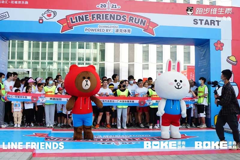 2021年羊城运动汇-花城欢乐跑-LINE FRIENDS RUN在广州国际媒体港欢乐开跑,超过2000名大小萌友踊跃参与!大家提前拿到可爱的能量物资包,穿戴好限定装备准备出发。欢笑声、欢呼声,加上振奋人心的音乐声,汇合成欢乐海洋。温顺的布朗熊、活泼的可妮兔等卡通人物一直为大家加油,冲向5KM终点更有动力啦,初夏美好的运动时光就该如此!