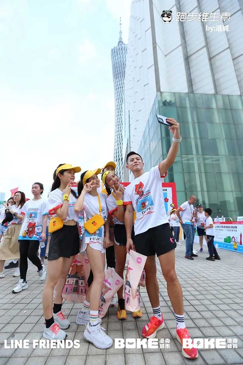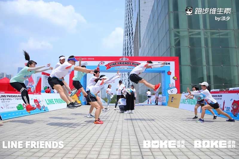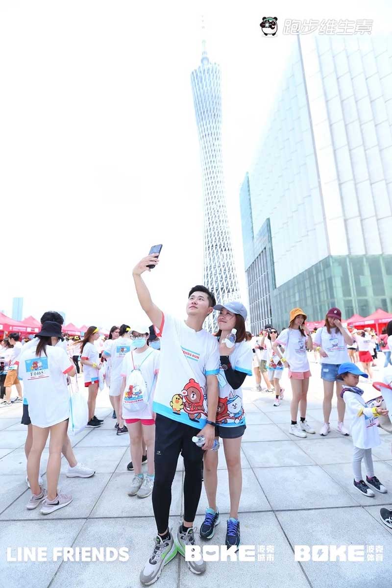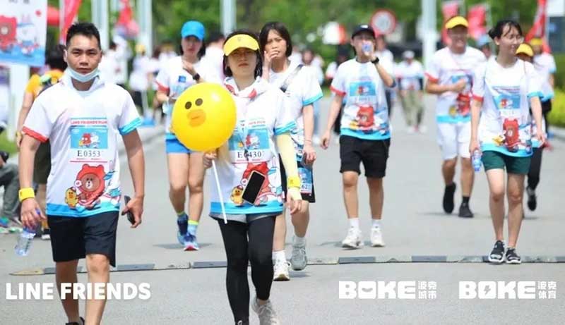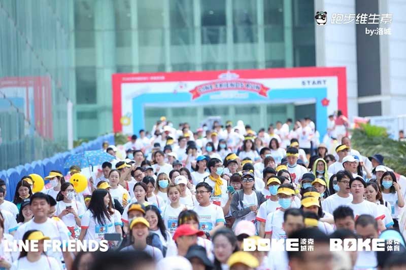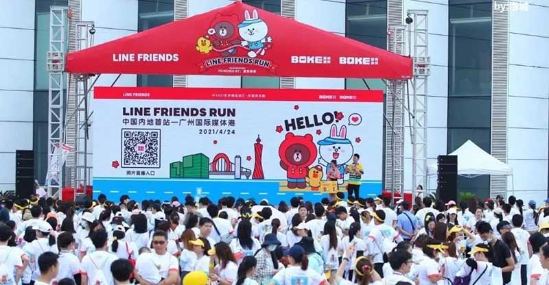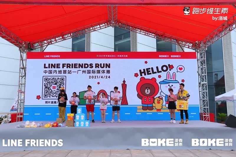 2021年羊城运动汇-花城欢乐跑-LINE FRIENDS RUN在广州国际媒体港欢乐开跑,超过2000名大小萌友踊跃参与!大家提前拿到可爱的能量物资包,穿戴好限定装备准备出发。欢笑声、欢呼声,加上振奋人心的音乐声,汇合成欢乐海洋。温顺的布朗熊、活泼的可妮兔等卡通人物一直为大家加油,冲向5KM终点更有动力啦,初夏美好的运动时光就该如此!