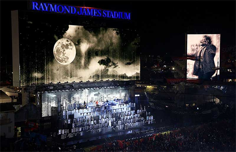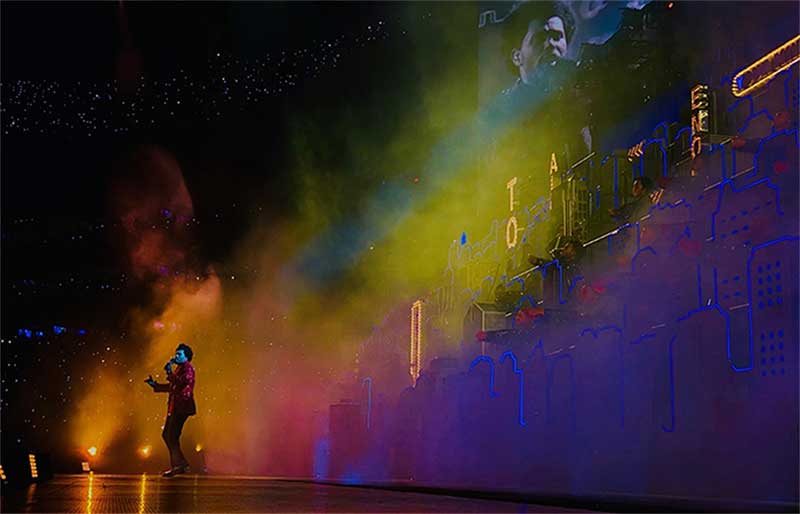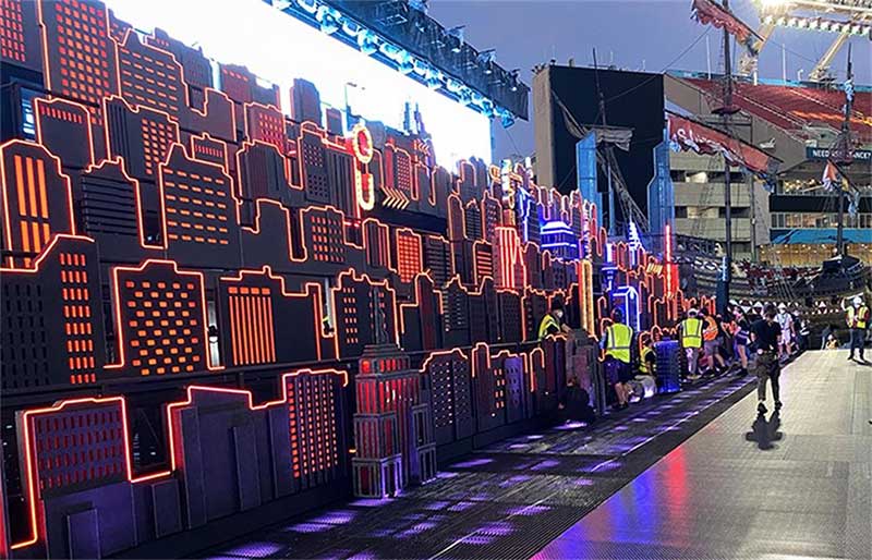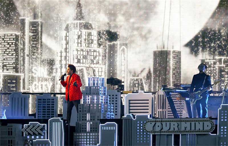 第55届超级碗(Super Bowl)上演了不同寻常的一幕。活动希望制作一些足够细节的东西,来创造大城市的感觉,但又要具有极简主义的风格,最终一个平面的灯箱和立体建筑模型的组合被确定下来,并使用了霓虹跑灯,以确保平面的舞美元素在立体的舞美结构中具有必要性。