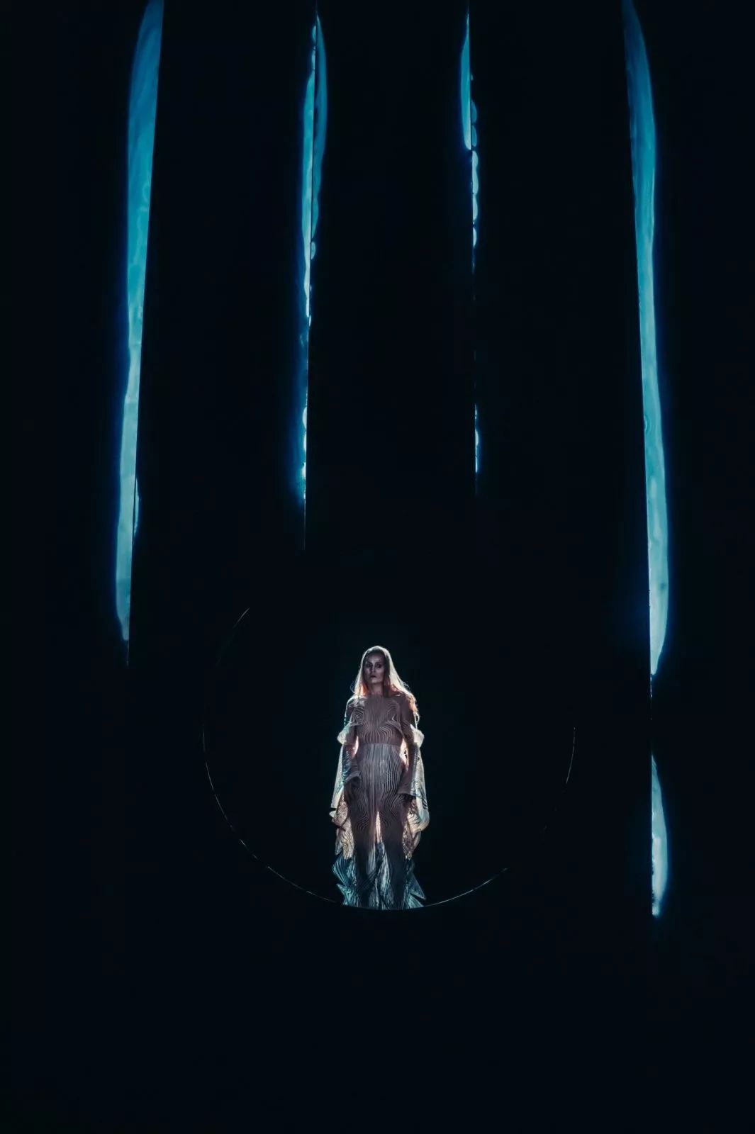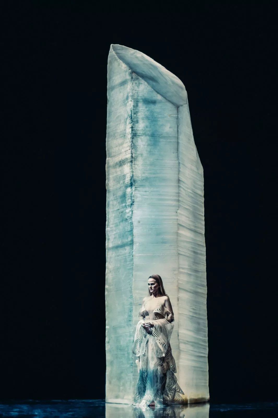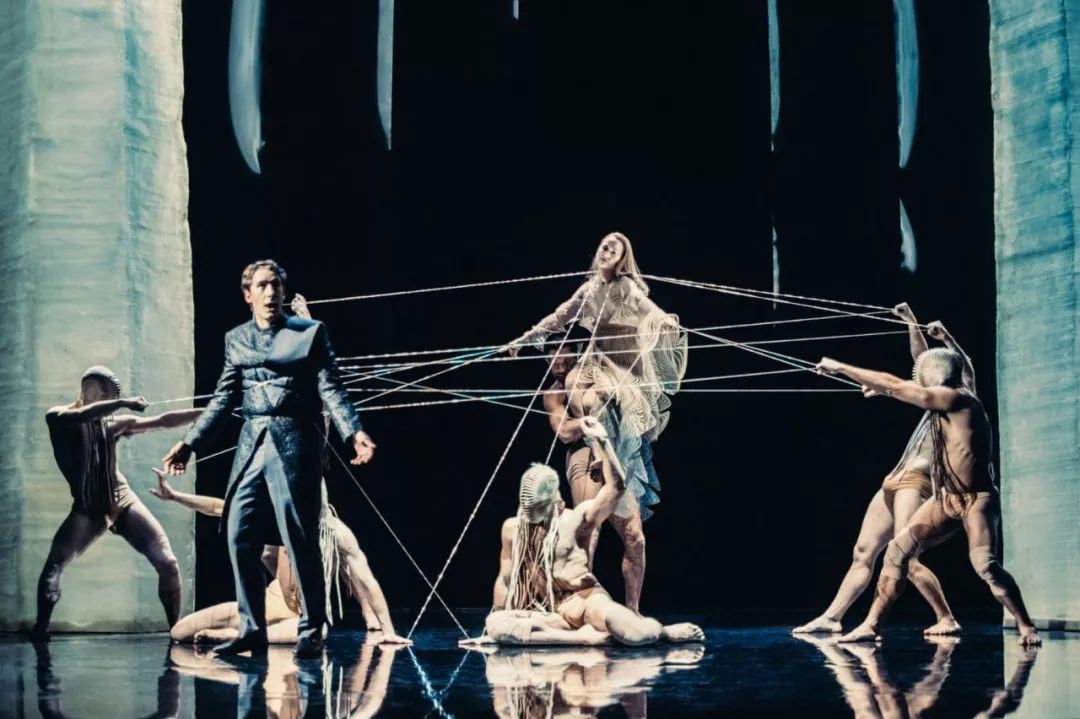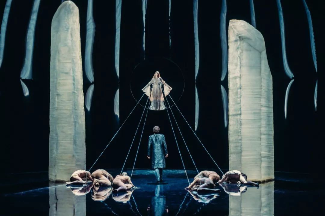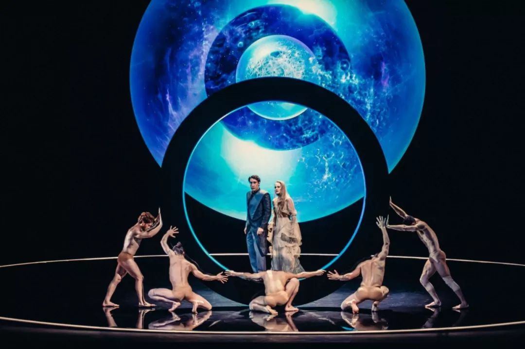 设计灵感来自许多提到”看”和”被看到”,以及反复出现的光主题,无论是地球——灯塔、灯,还是宇宙——太阳、月亮、星星——、切尔卡维、贾莱特和阿布拉莫维奇,整个歌剧都设置在一个黑色的球形空间中。