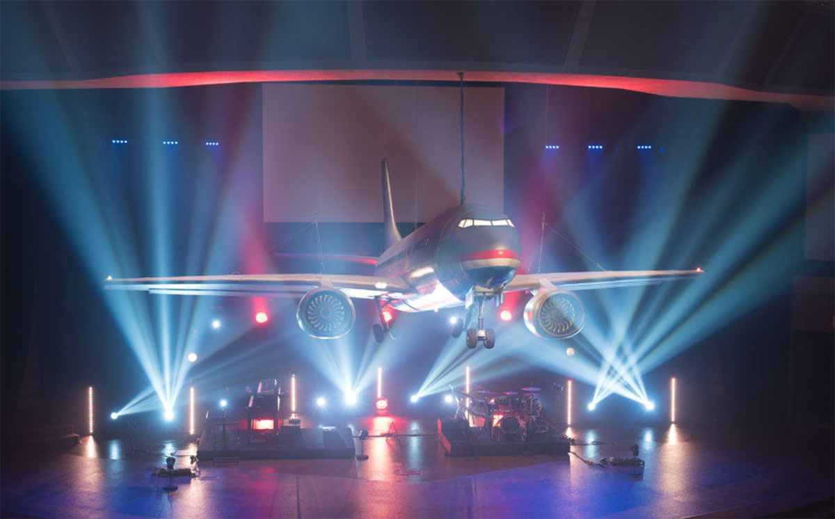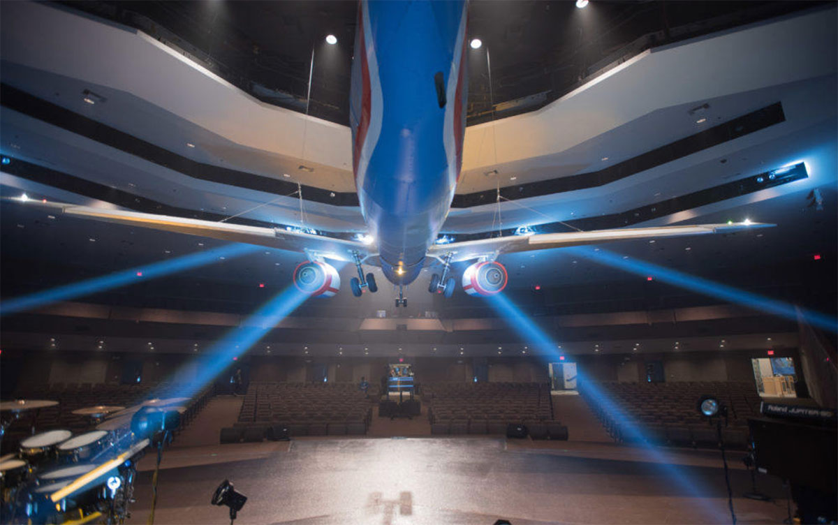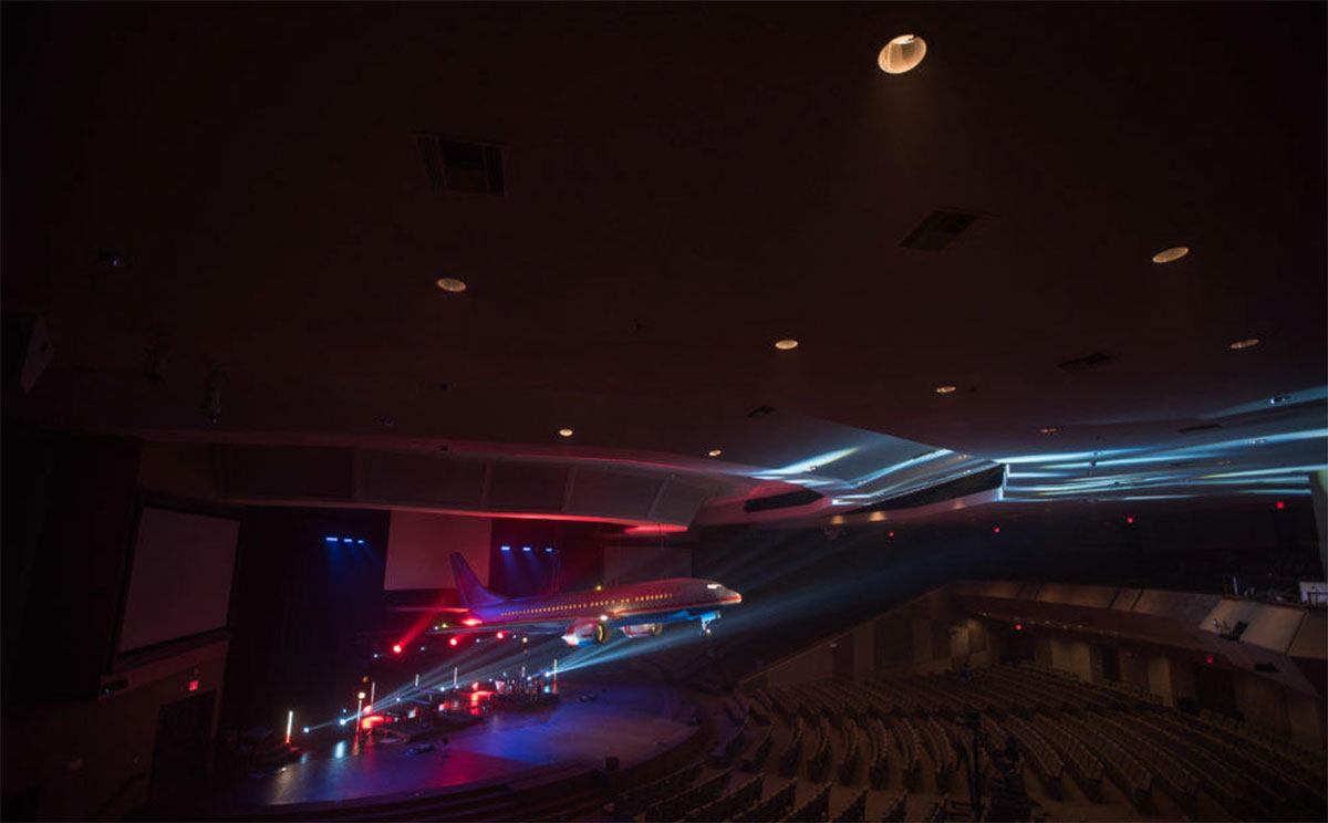 舞台搭建了一个叫做Take Off的布道系列,牧师要求一架飞机悬挂在舞台上方的天花板上。 因此,舞台搭建了这样一台飞机! 整个舞台太震撼了。