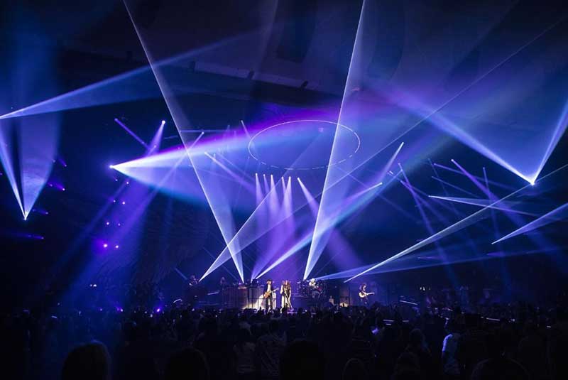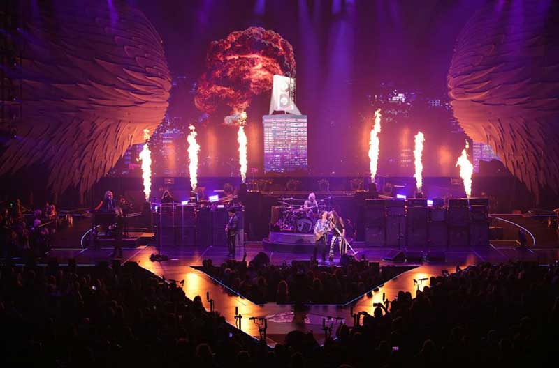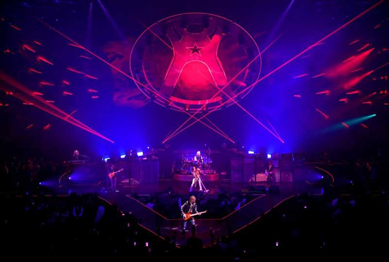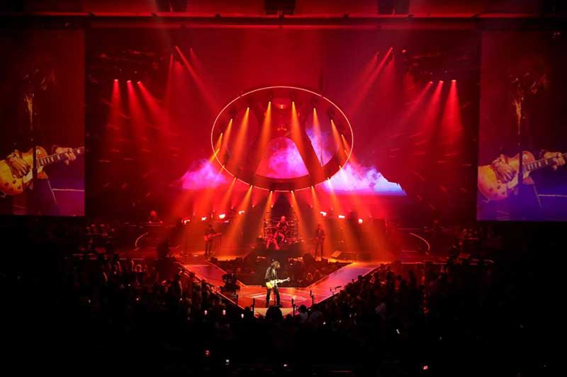 此次舞台设计了巨大的摇滚灯光,大量的视觉元素和一些巨大的布景,它更像是剧院+摇滚现场,融合了许多数控科技。基于场地因素,在舞台的造型上并没有做过多的设计,而是将重心放置到了空中和舞台的功能性上。演唱会主视角以乐队的LOGO标志为基调展开设计,一个巨大的“A”标志悬浮在舞台上方,“A”既是舞台背景又是灯光装置的载体。另一个比较独特的设计是80米宽的3D羽翼,作为舞台元素,是非常壮观的,与字母“A”标志一起出现,则代表着Aerosmith乐队。在观众的上方,有五个大型充气玩具在上上下浮动,还有一座大桥,把乐队带到剧院的第二个阳台上。强烈的灯光,创造意境,为音乐注入活力,带动全场气氛,在这里,任何时候灯光设计都会考虑到视频内容。