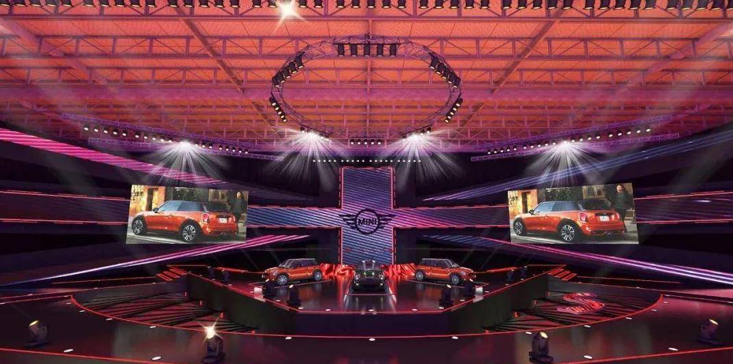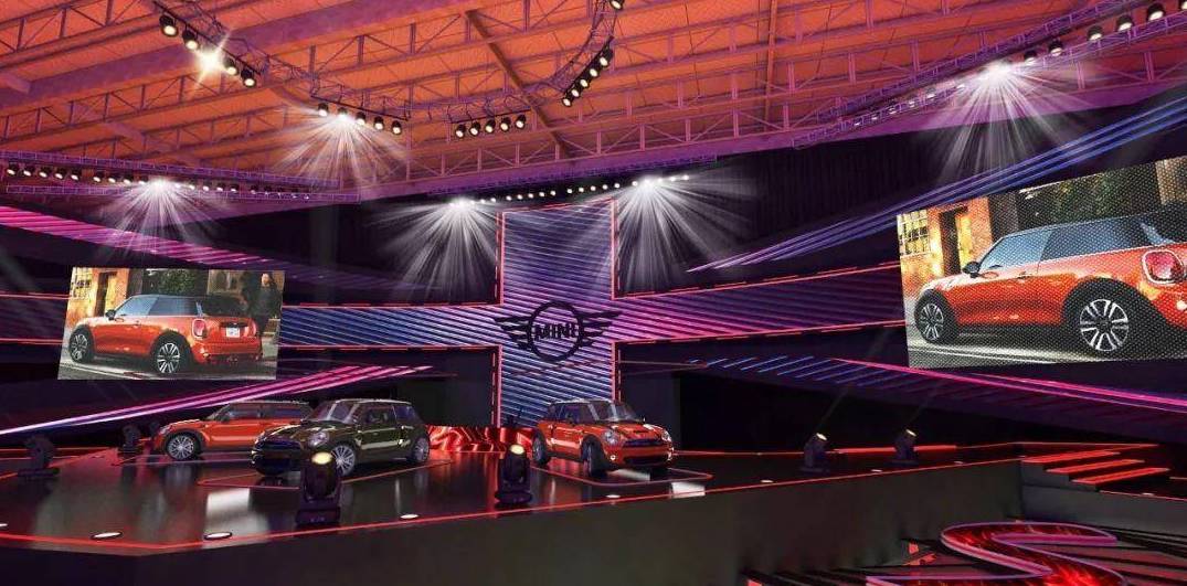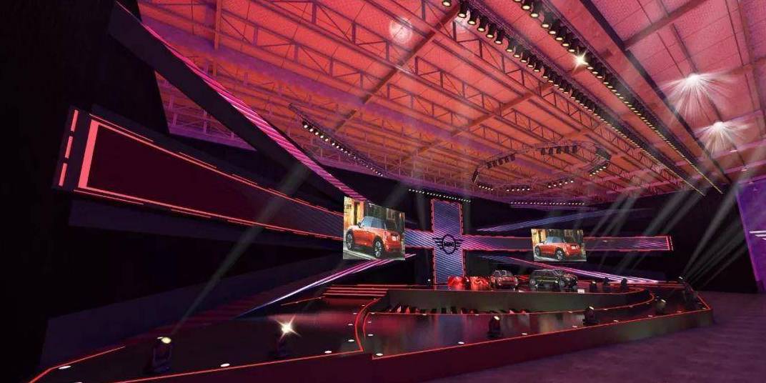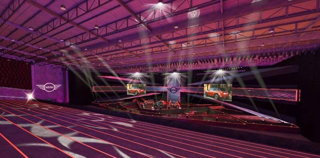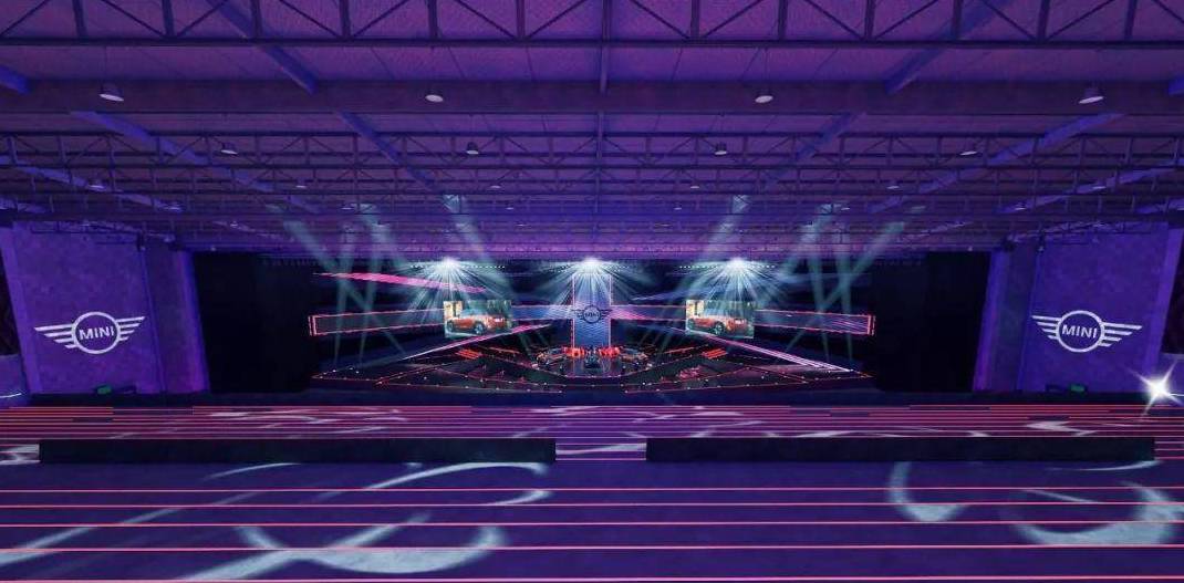 亮点:不仔细看,舞台造型是不是特像雪佛兰的发布会,可以看得出来,舞台背景造型是用两条跑道进行设计的,场下的观众区是采用阶梯次进行布局,再用MINI的logo线条进行点缀,与舞台相呼应。