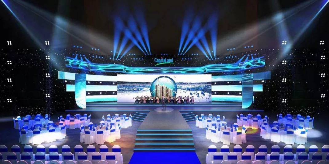 亮点:整个舞台是“半圆”开放造型,以弧形条幅屏作为主屏两侧的衬托,而在舞台两边,另有2块彩屏进行视觉上的内容呈现。