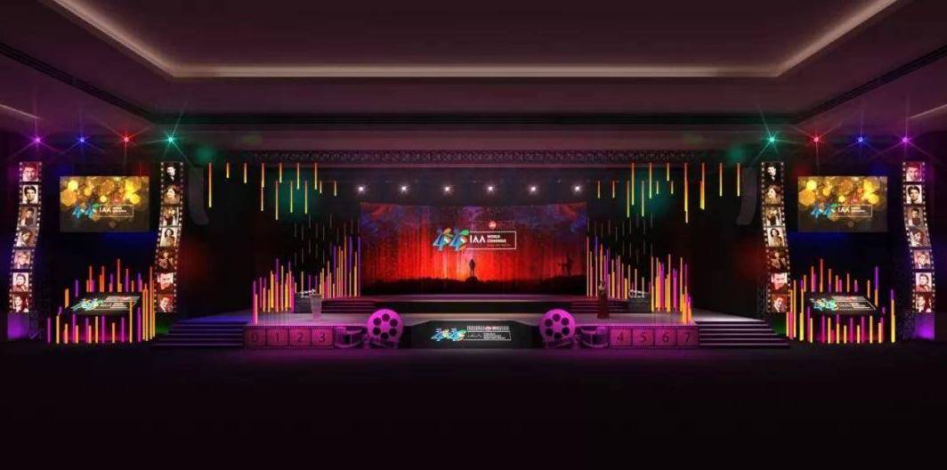 亮点:这场活动是全球广告、公关人的一大盛会,在舞台设计方面,自然创意十足,舞台背景两侧用曲线屏进行装饰,在晚宴的舞台设计上,融入了电影的元素。