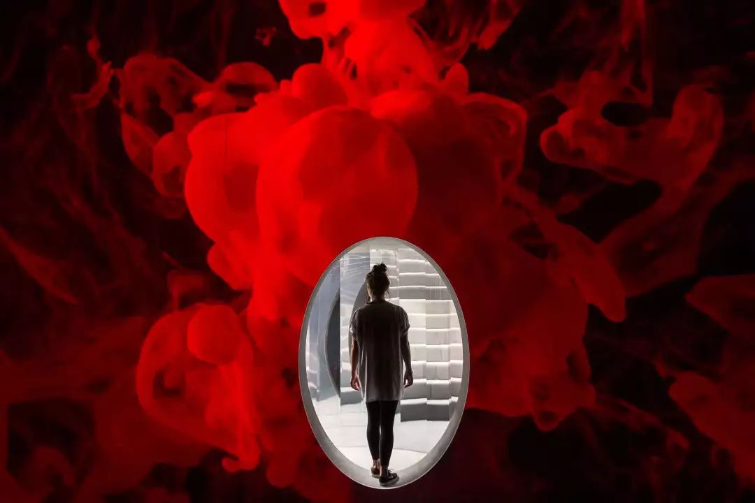 镜中迷宫(Mirror Maze)由4个屋子组成,前三个屋子通过使用来自于伦敦、巴黎、里约、洛杉矶街道的4片video projects和声音设计(来自于她孩子的手机和街道传来的声音)来探索记忆力中由于香气而出发的记忆。最后一个房间被红色灯光照亮。从中间的入口进入,即被红色包围,游客豁然进入全新的空间,带来的冲击力和神秘感十足。