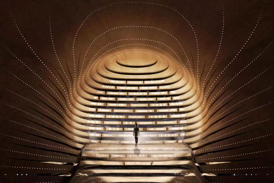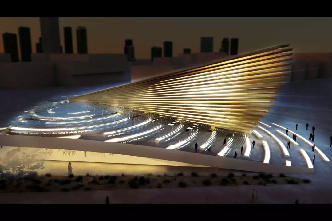“诗亭”(Poem Pavilion)设计的灵感来自于物理学家斯蒂芬•霍金2015年的最后一个项目“突破信息”:霍金和他的同事意图通过一场全球竞赛,邀请全世界的人一起来思考,如果有一天我们在太空中遇到其他先进的文明,我们要传达什么信息来表达我们的星球。这个项目以照亮的“空间信息”为特点,实际上是一个发光的交流LED屏幕和灯光照明的迷宫。这个项目将邀请世博会参观者参与其中。