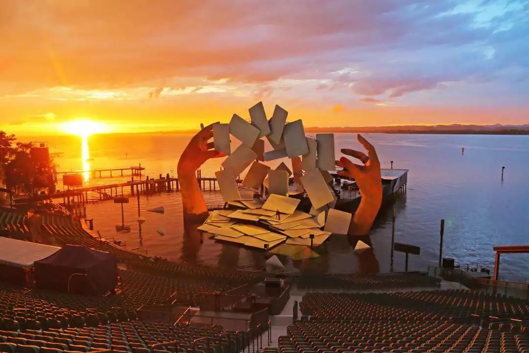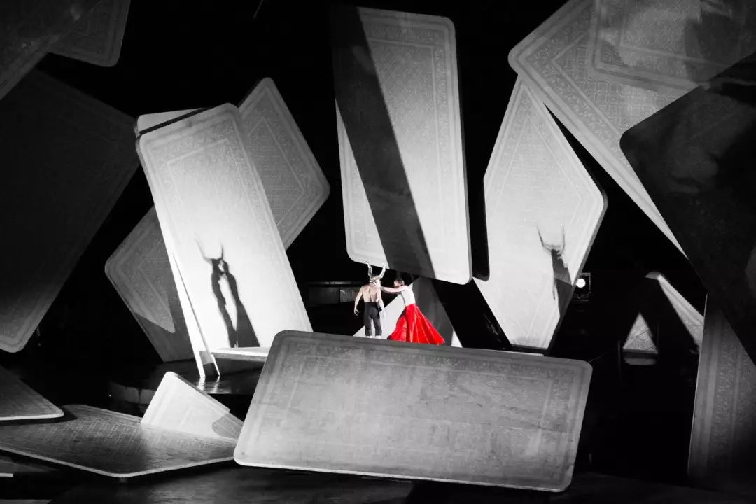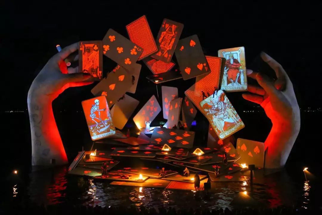 设计灵感来自歌剧中的一个场景。“卡门看完自己的运势,把纸牌扔向空中——为他们下落时未知的方向做准备。”动态瞬间凝固成景。在布列根斯音乐节上,艾斯·德芙琳为歌剧《卡门》创造了一个雕塑般的背景,25米高的双手散开一副纸牌。舞台漂浮在康斯坦斯湖上。散落的纸牌、夹着烟的双手从水中升起,戏剧张力十足。背景辽阔的天空加重了布景的荒诞感。