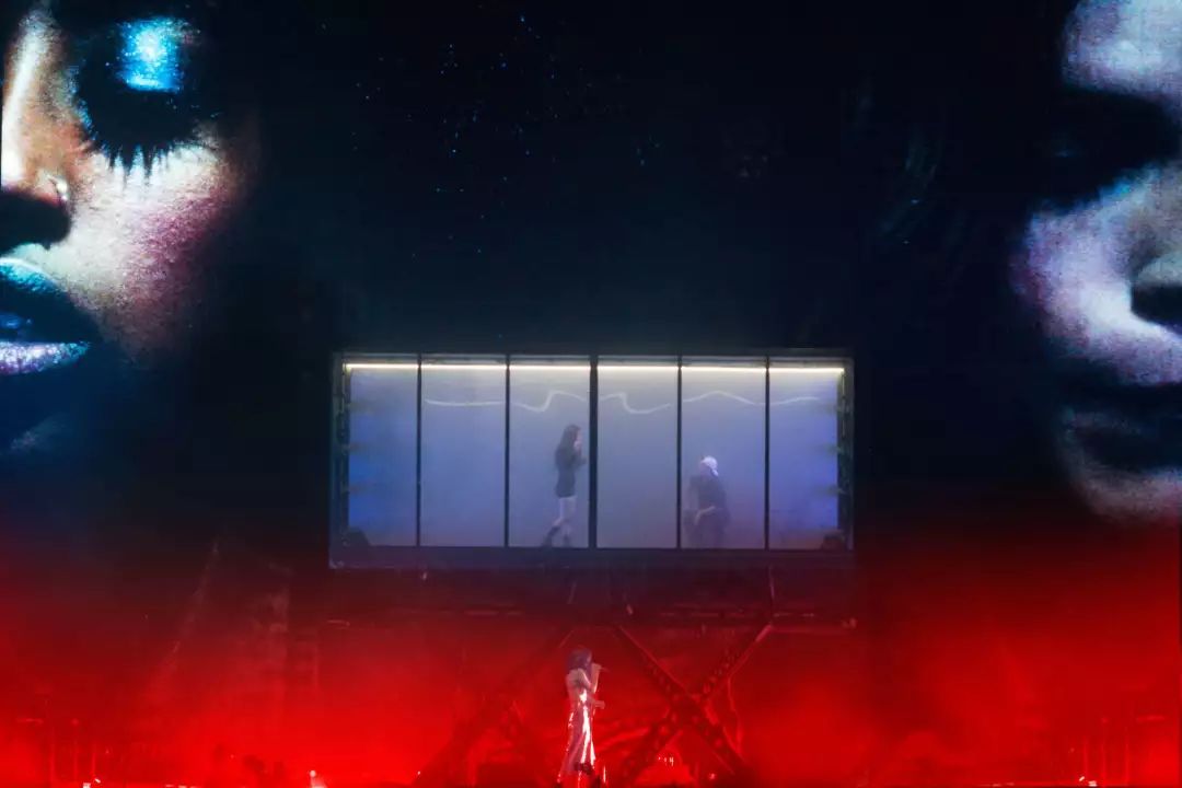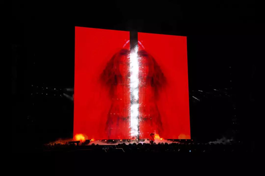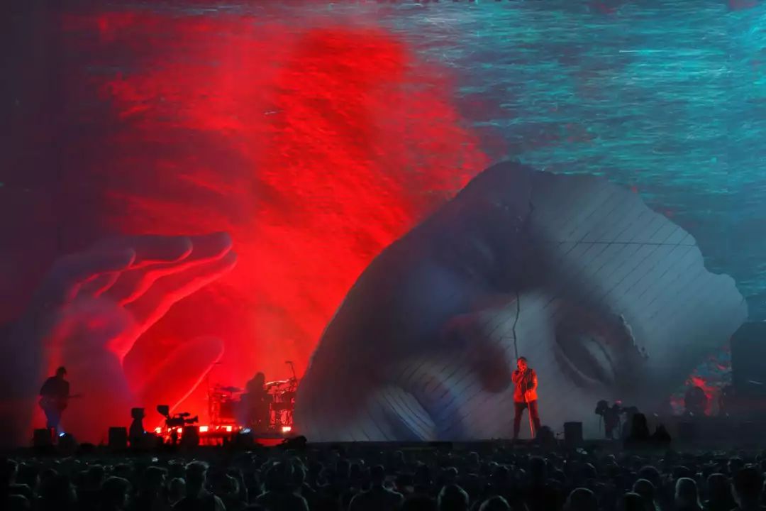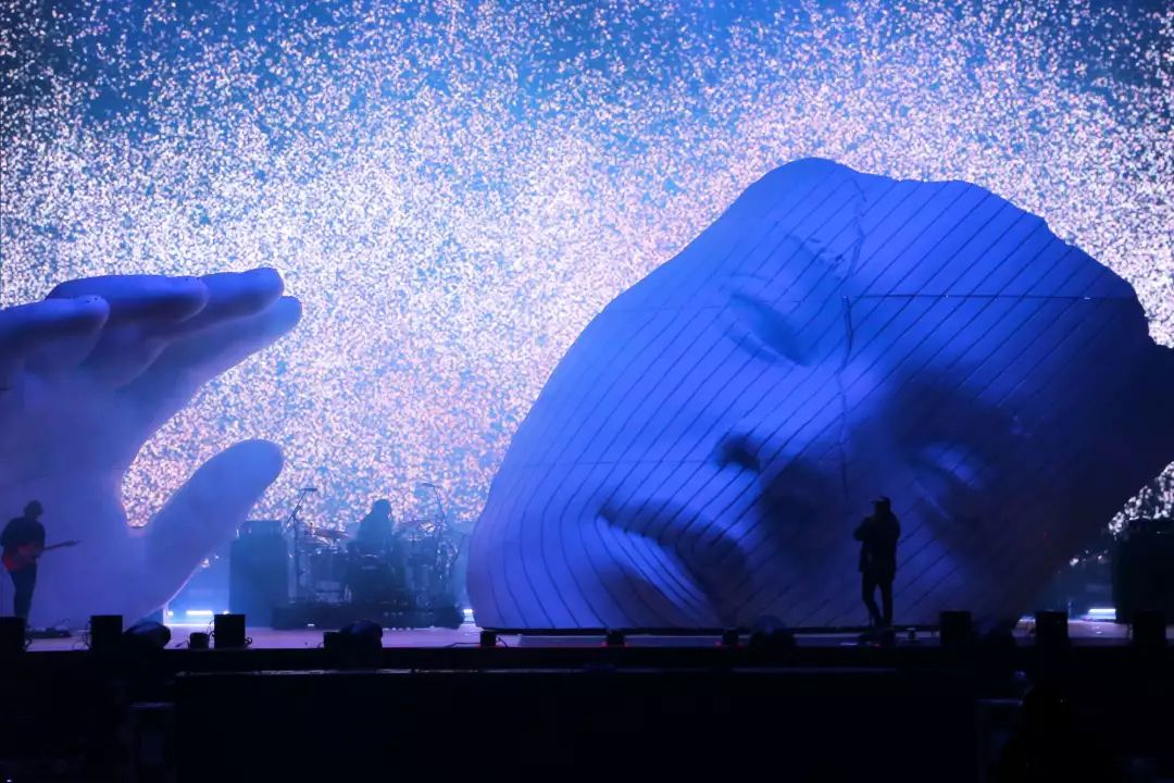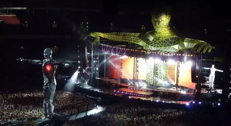 在U2乐队“体验+纯真”巡演中,艾斯·德芙琳利用AR技术,在舞台中央设计了一个悬浮的巨大Bono化身。它打破了第四维度的空间体验,使演出以一种更奇妙、更亲密的方式与现场的观众进行互动。这种体验神秘而遥远,如同外星物种入侵一般。