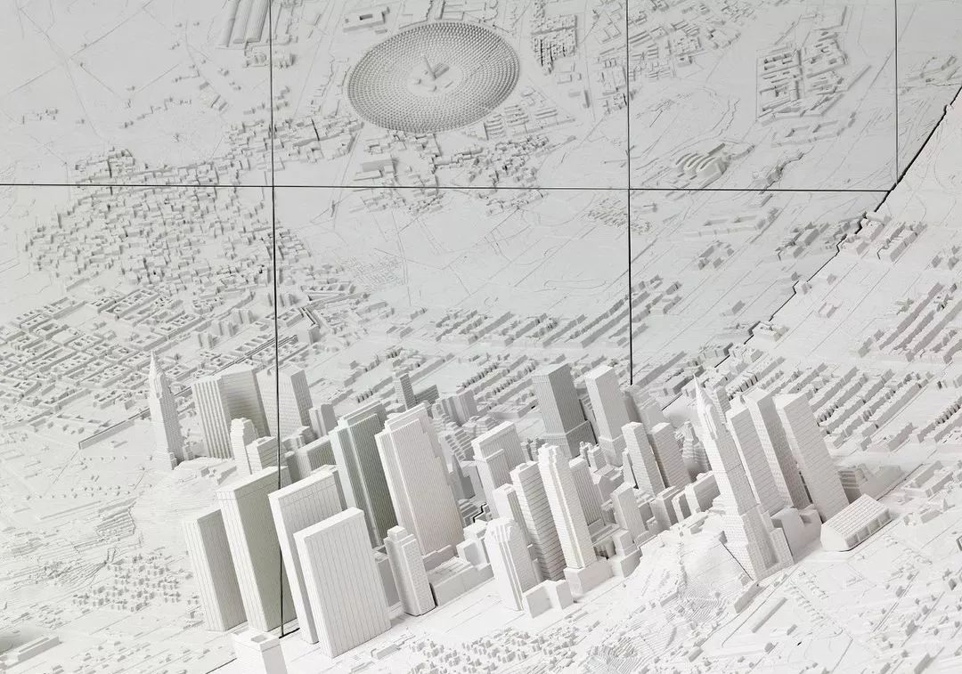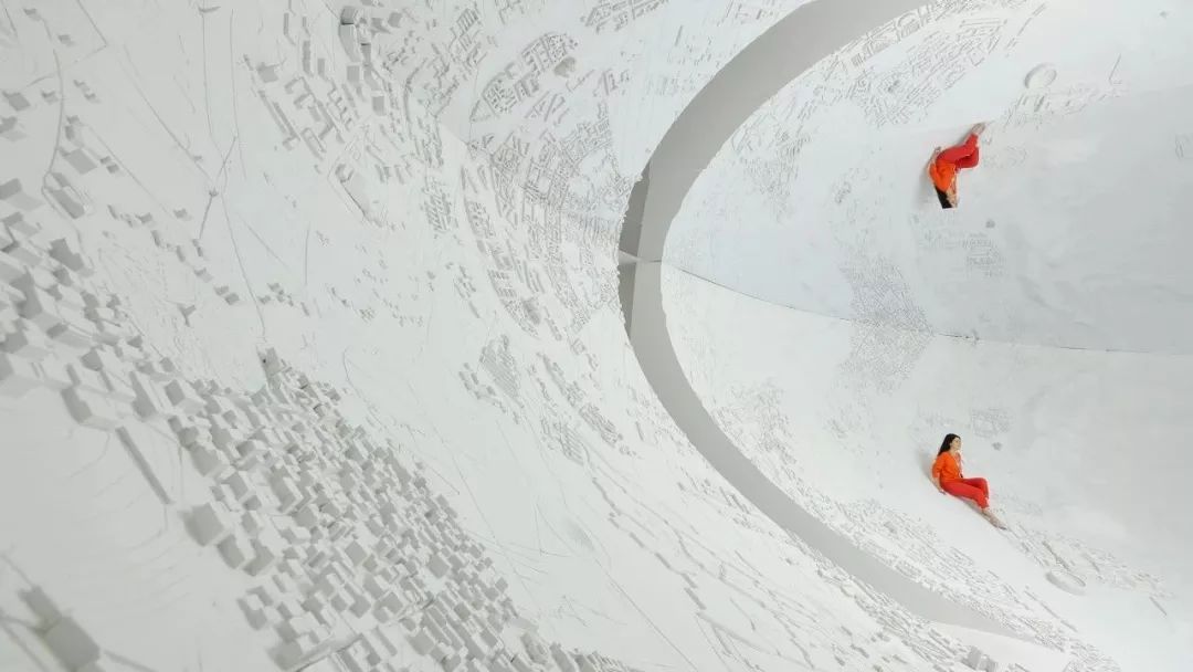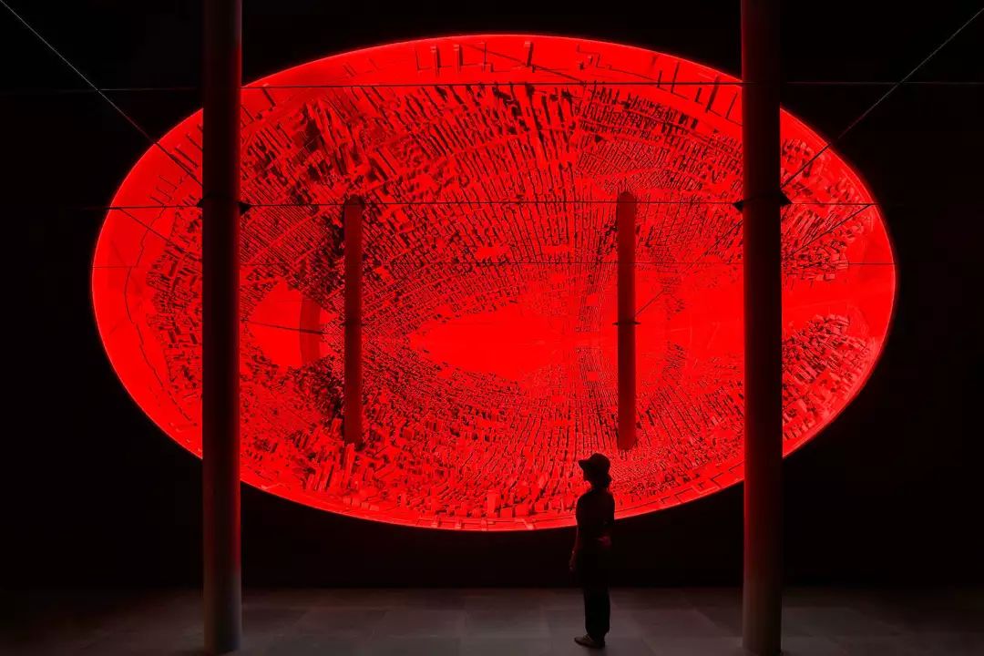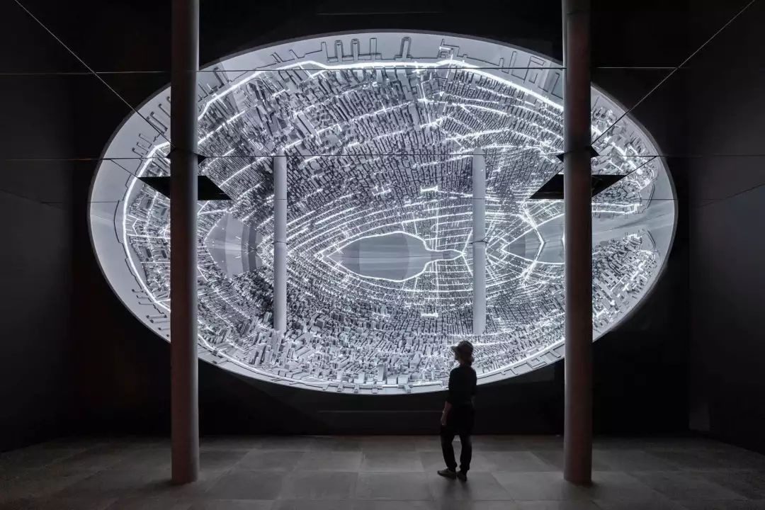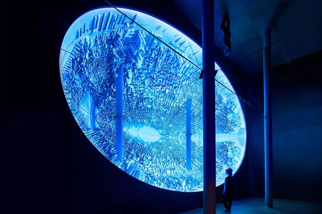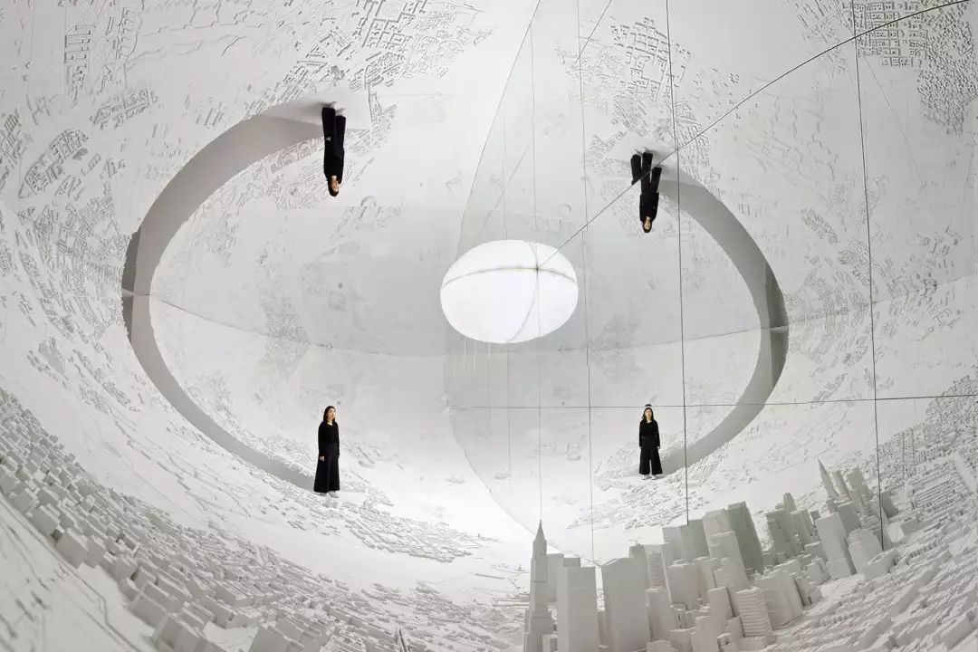 在纽约的XI画廊,一颗大型的半卵状镜面模型里影射了整个纽约。艾斯·德芙琳从Ingels的建筑中汲取灵感,镜面向内弯曲,灯光在设定好的路径下移动,由蓝到白,神秘莫测。站在The Egg面前,如同站立于宇宙之外,观众不自觉地陷入了一种更深层次的思考。