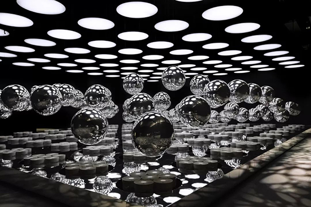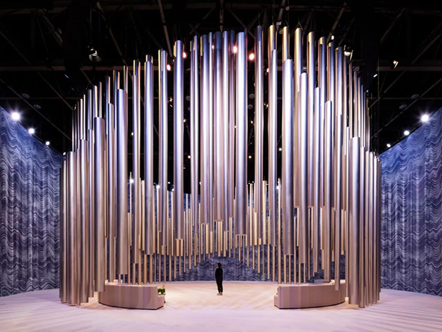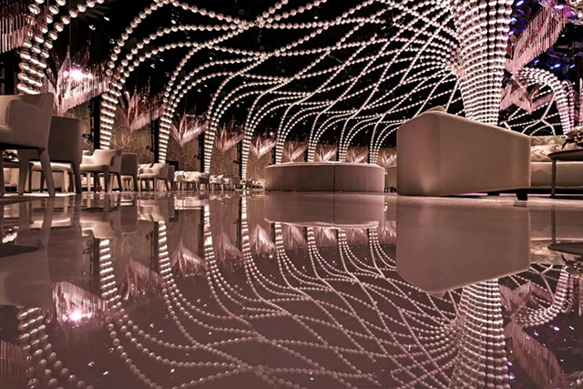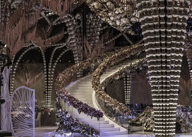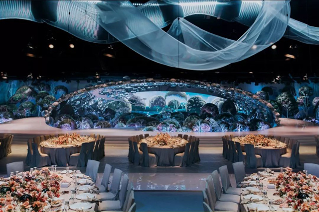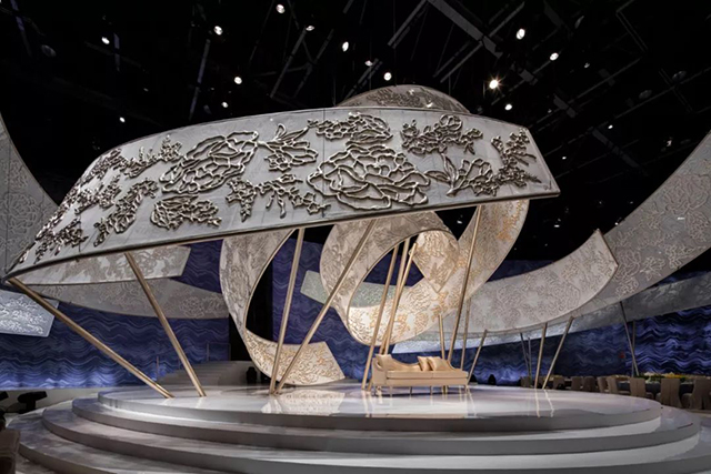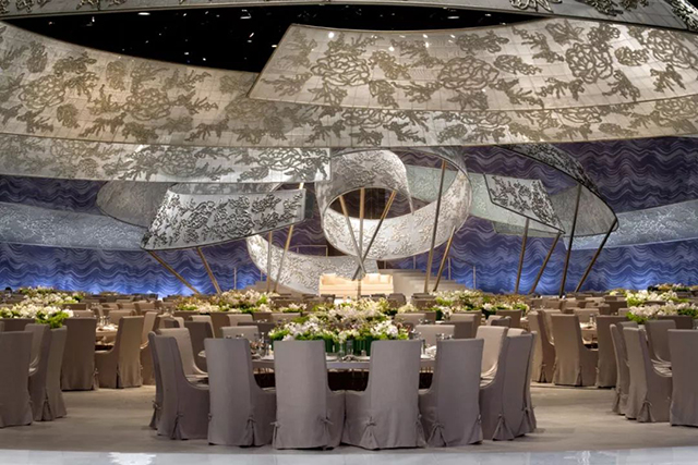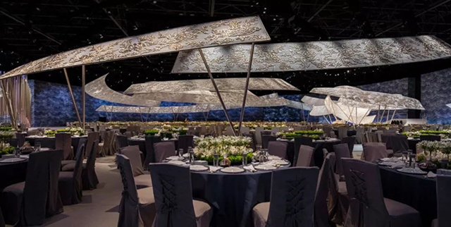 迪拜的DWTC里的1500平米会场,大型弯曲的“丝带”悬挂在天花板上,丝带以金属纹理设计为特色,浮雕如刺绣,并以花边为灵感,上方旋转的缎带以极点固定在舞台上,给人一种提升天花板的感觉,同时引导视线到达主舞台。深蓝色墙壁模仿波浪大理石的纹理为蕾丝天花板装饰增添了丰富的质感,营造出魔幻的色彩和动感的完美组合。