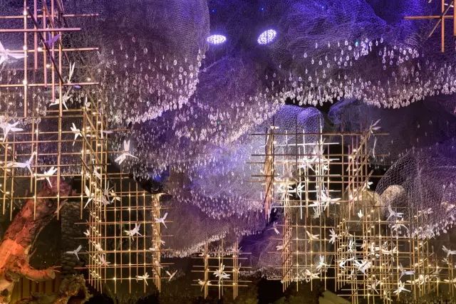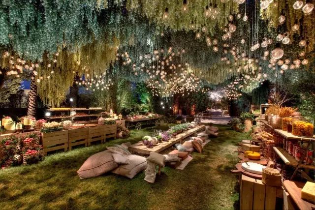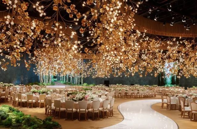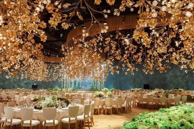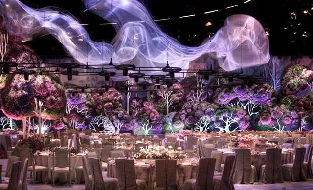 丛林仙境主题的婚礼,以绿植作为主要装饰物,树枝上挂上闪亮的小球,为整个空间营造出浓厚的浪漫气息,悬挂在天花板的几何编织物,加上发光的亮片,紫色聚光灯打下,将浪漫氛围推向高潮。