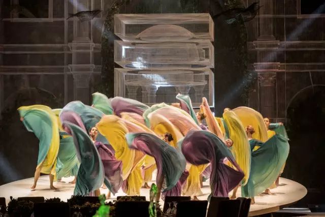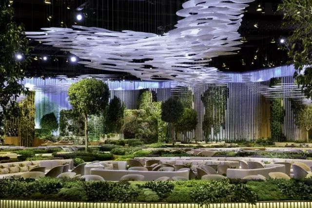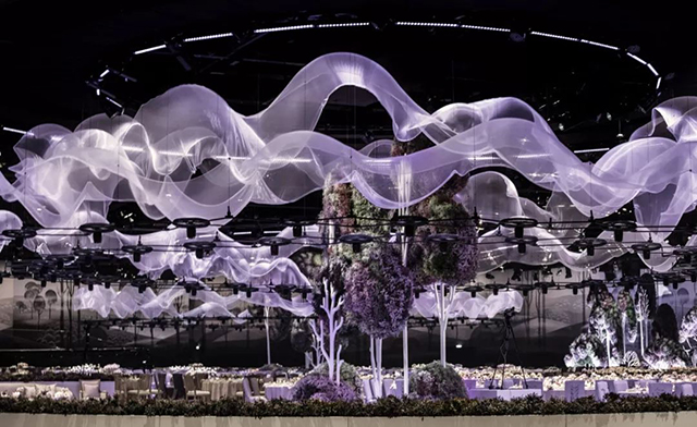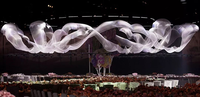 这个1800平米的会场位于迪拜的DWTC,设计结合技术、艺术等元素,创造一个空灵无限的美丽场景, “晨雾”由轻质面料构成的天花板装置,并采用风向控制的同步运动,悬浮或零重力的感觉营造了梦幻的效果,这样的视觉概念与舞蹈表演相结合渲染了现场的空灵感受,让场景变得非常梦幻。