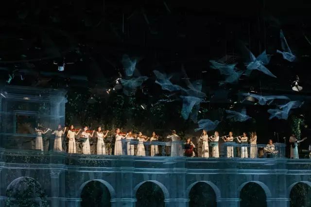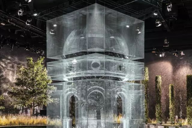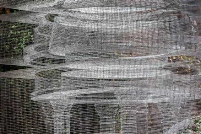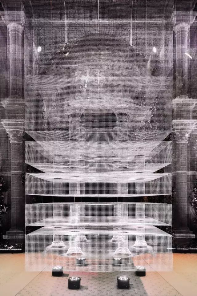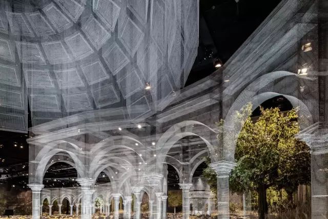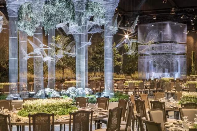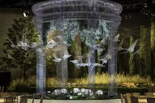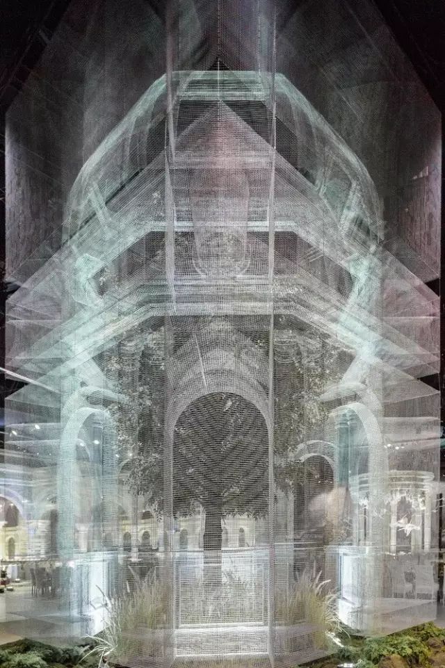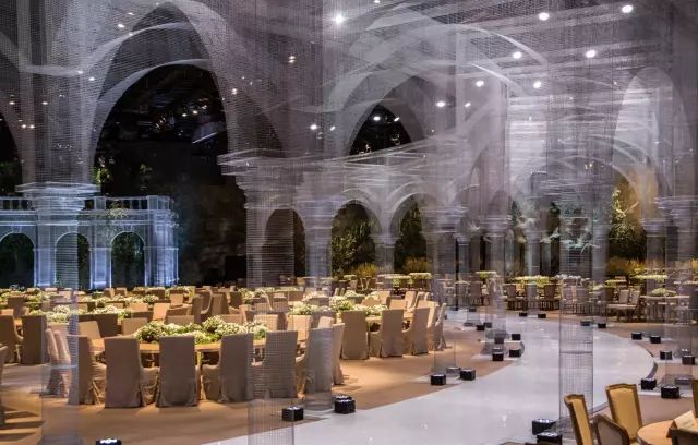 这座被称为“建筑的幽灵”的艺术品,在阿布扎比国家展览中心的皇家婚礼上震惊了在场所有人,设计灵感来源于欧式的古典中庭建筑,却又不局限于古典本身。半透明幽灵般的外观打破了传统的古典主义,让建筑游走在虚与实之间,成群缠绕的飞鸟围着宫殿起舞,为新人送上最美好的祝福。这座透明宫殿建筑是由DesignLab Experience与意大利雕塑家Edoardo Tresoldi在8000平方米的活动空间设计,把图纸一比一打印放在现场,对装置和飞鸟进行定位。Edoardo Tresoldi是一位喜欢利用不寻常的材料来创作的艺术家兼设计师,生动而逼真的雕塑或装置常常令人难辨真假,正如这座虚幻的宫殿,便是用镀锌铁丝制成。罗马式的穹顶和整齐排列的圆柱,Tresoldi将古典与现代的语言融合,一根根巨大的罗马柱撑起的连廊有序的将宾客座位席分隔开,后面的绿植若隐若现,为建筑增添了更多的生命力。这样庞大的钢丝网工程竟全是由手工焊接制作,再将焊接好的每一片进行拼接而成,每个焊接点和角度都做到极致才能造就如此完美的网状宫殿,当灯光打到建筑上,整个场景犹如3D全息投影效果,虚无缥缈中又带了些真实感。