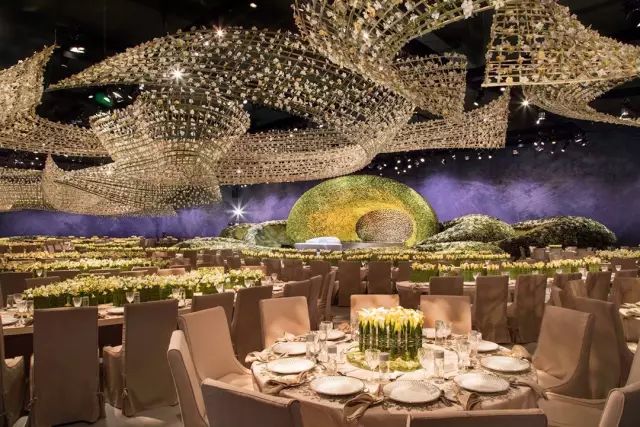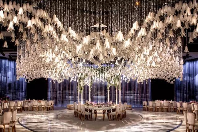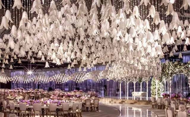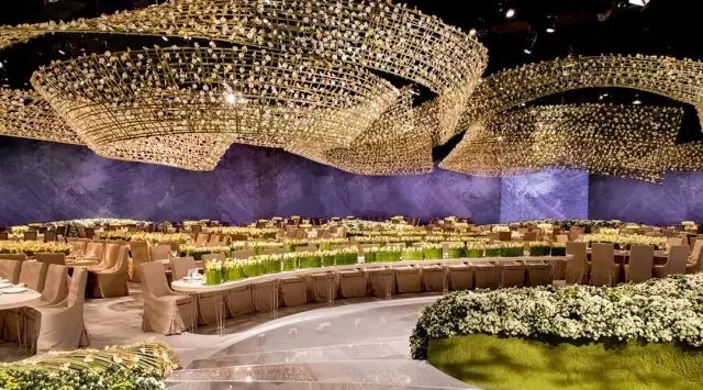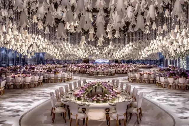 由九千多朵特制树脂花打造的天花板,任何新娘看到了都会激动得落泪吧,树脂花连接着水晶绳悬挂在天花板上,呈现出一幅闪耀的花满天画面。