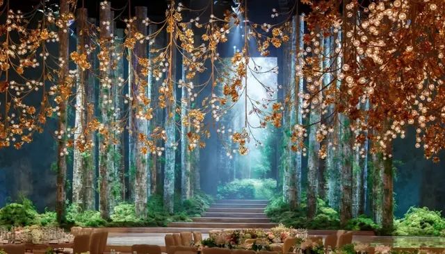 看腻了太过鲜艳四射的婚礼,就选择别有一番风味的,枫叶颜色为主题背景,金棕色与绿植结合,犹如漫步在充满魔力的森林中。