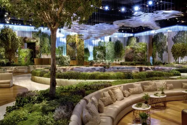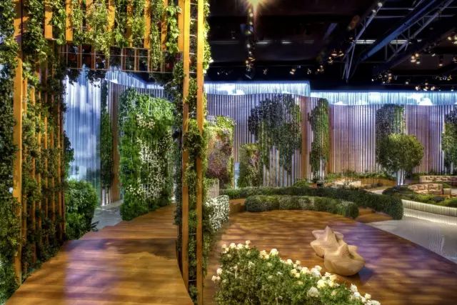 由竹子和鲜花制成的抽象雕塑,延绕着天花板形成动线,设计师将雕塑与鲜花融合,创造出一个三维视觉效果,黄色与绿色进一步突出了花香在空间中的穿透力。